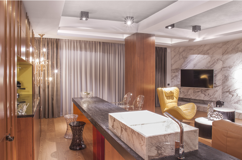 • legatura prin similitudinea amenajarilor din piatra – ceea ce ai in bucatarie pune si-n living (cel putin la nivel de accente). Legatura va fi subtila, insa suficienta pentru a marca o continuitate;