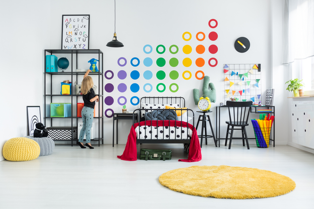 La varste mici, o buna idee de amenajare in camera fetei poate fi aplicarea stickerelor colorate pe pereti. Fie ca alegi unele cu animale amuzante, masini sau unicorni, dinozauri sau buline colorate, aceste stickere dau viata si farmec incaperii cu un efort minim. Sunt usor de aplicat si indepartat, asa ca le poti schimba ori de cate ori doresti, fara sa afectezi in vreun fel finisajul peretilor. Decorarea peretelui camerei de fete cu stickere poate fi o activitate distractivă și creativă pe care o poti face împreună cu fiica ta, petrecand timp de calitate in procesul de decorare a camerei ei.