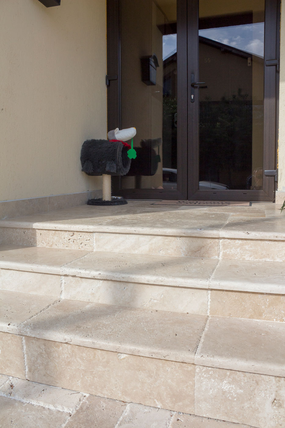Scări exterioare: Datorită proprietăților antiderapante, travertinul este potrivit pentru treptele exterioare, oferind atât estetică, cât și siguranță.