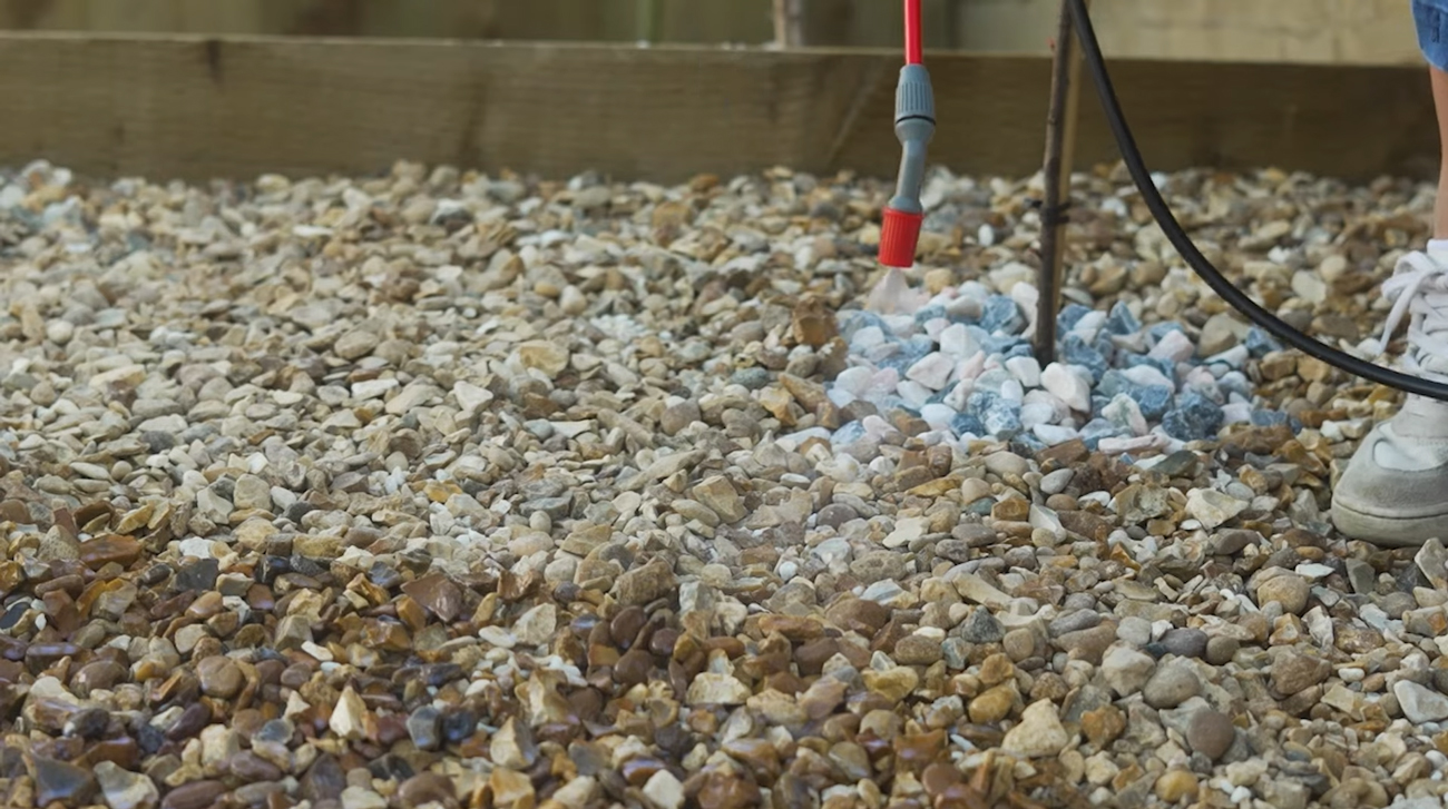 Spray-on / Pulverizare sau “pour on” – dacă pietrișul e deja pus. Aplică uniform, evită să laşi pietrele saturate.