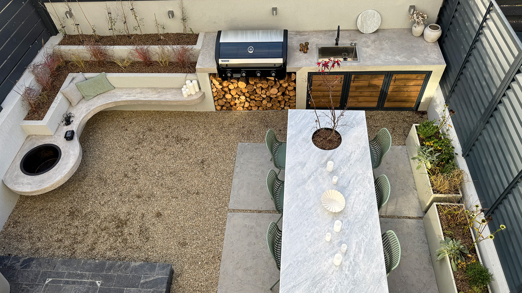Tot din beton a fost realizată și bucătăria de vară, cu blat în care sunt integrate grătarul și chiuveta. Sub blat au fost montate uși pentru mascarea instalațiilor, creând în același timp singurul spațiu de depozitare al grădinii.