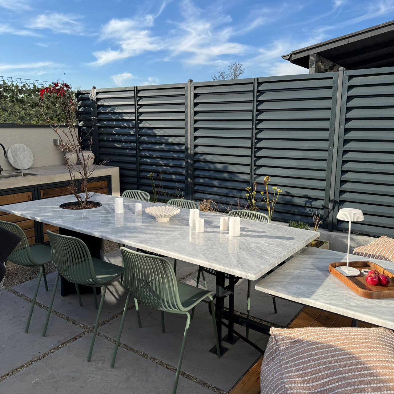 Un aspect mai dificil a fost reprezentat de garduri. Într-o tipologie de tip townhouse, vecinii se află pe fiecare latură, ceea ce a limitat posibilitățile de intervenție. Totuși, pe măsură ce plantele cățărătoare se vor dezvolta, această problemă va deveni mai puțin vizibilă.