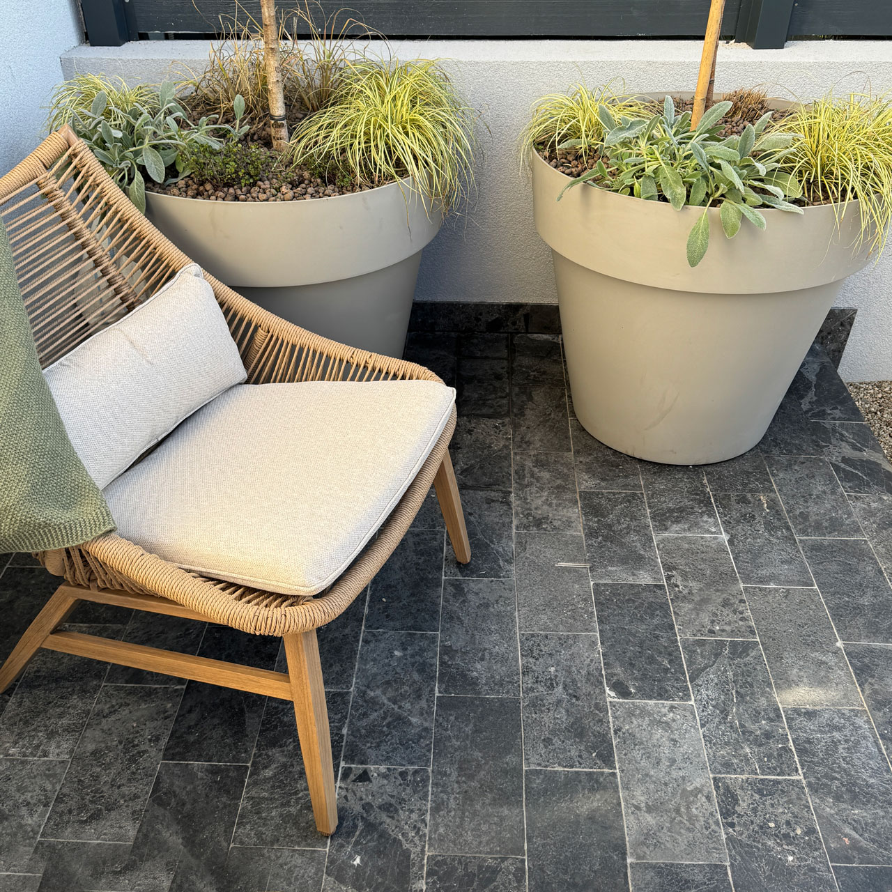 Primul sentiment pe care am vrut să îl elimin din experiența utilizatorilor a fost tocmai stresul. Am renunțat la gazon și am folosit doar plante în jardiniere, cu întreținere redusă și foarte bine adaptate condițiilor de lumină și temperatură ale spațiului. Materialele au fost alese atent pentru a fi durabile și rezistente la intemperii: piatră naturală, lemn tratat pentru exterior, beton aparent și pietriș decorativ.