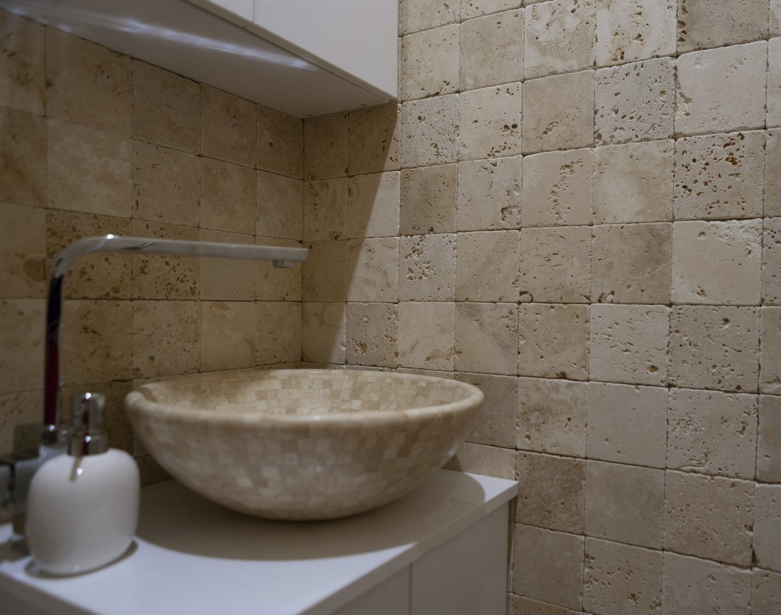 Amenajarea contrablatului cu travertin Classic Cross Cut Antichizat 10 x 10 x 1 cm, sursa foto: PIATRAONLINE