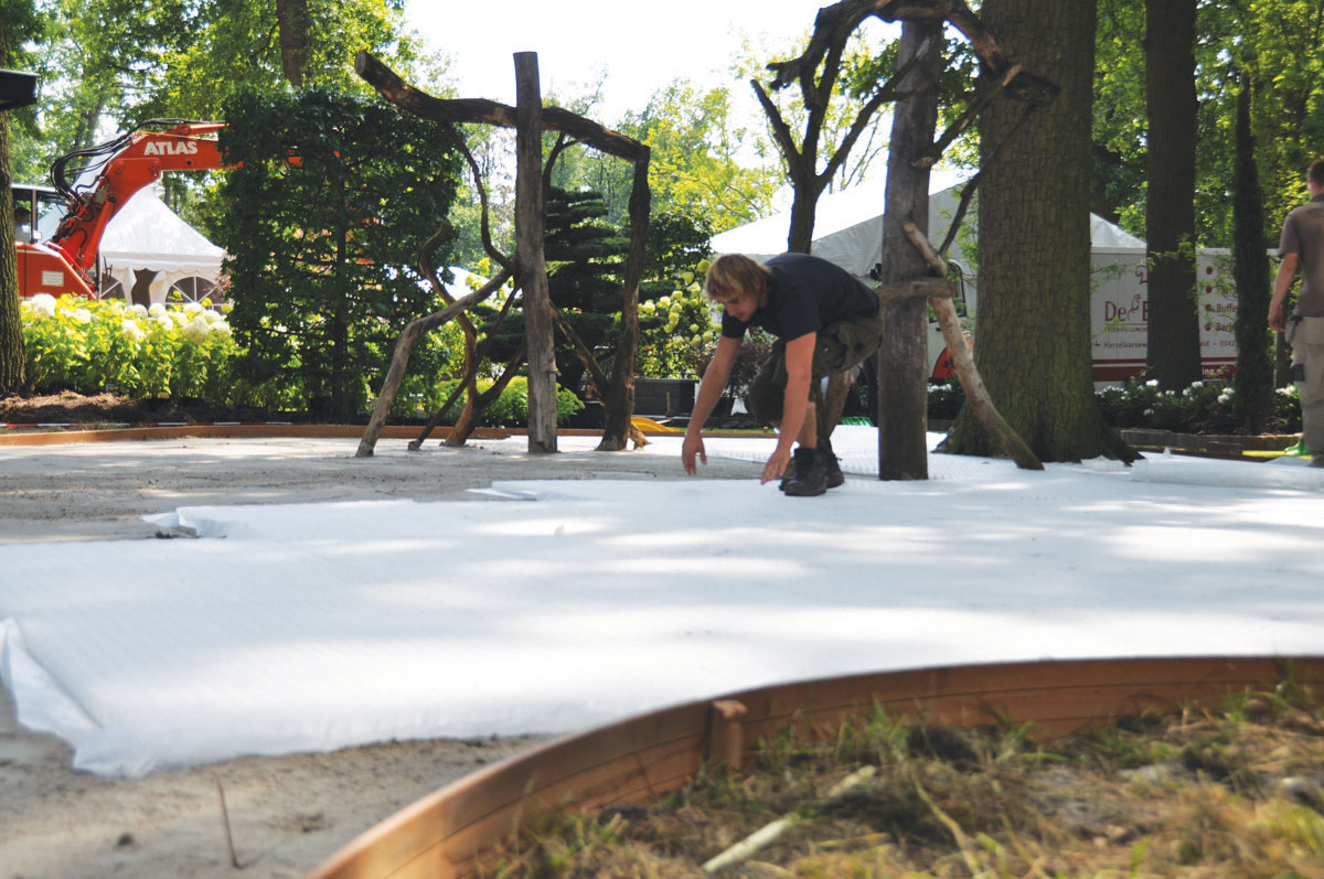Așezarea panourilor Gravel Fix® Pro: Montajul plăcilor de stabilizare se realizează într-un mod foarte simplu, prin așezarea lor succesivă pe stratul de nisip pregătit. Fiecare panou Gravel Fix® Pro are pe două laturi o prelungire de geo-textil (o „fustă” de material textil care depășește conturul fagurelui). La montaj, aceste prelungiri se folosesc pentru a suprapune panourile adiacente: se așază un panou nou astfel încât partea sa marginală cu geo-textil să vină pe sub marginea panoului deja pus alăturat. În acest fel, panourile se interconectează ferm, iar suprapunerea geo-textilului împiedică apariția golurilor și a vegetației la îmbinări, conferind totodată stabilitate și continuitate stratului suport. Se continuă așezarea panourilor pe întreaga suprafață, acoperind zona delimitată. Dacă este nevoie, plăcile pot fi tăiate (vezi pasul următor) pentru a se încadra perfect la margini sau în jurul unor obstacole.