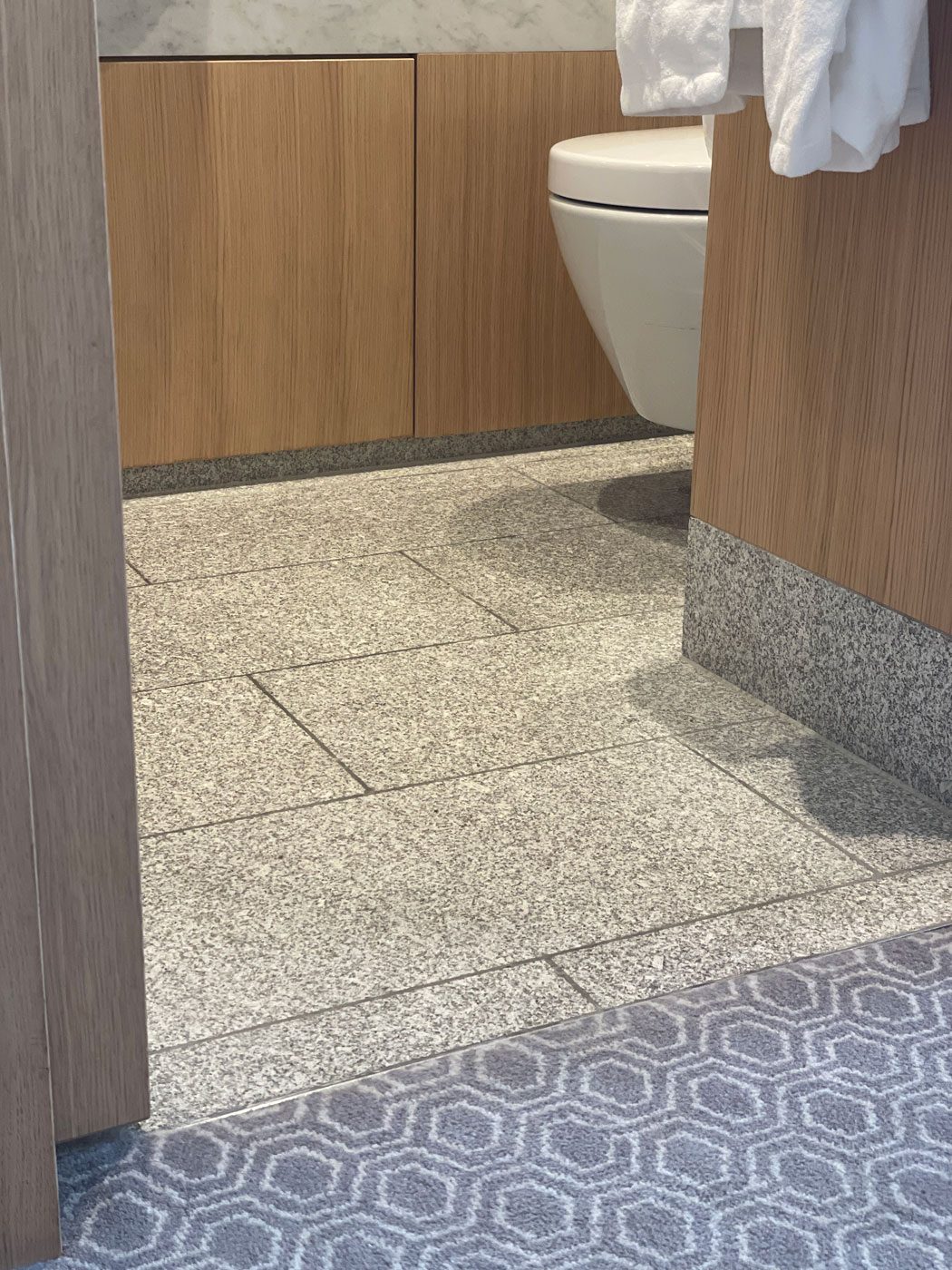 Detaliul de la prag, unde podeaua din granit se întâlnește cu o mochetă în nuanțe gri cu model hexagonal, subliniază atenția la detalii și confortul acustic. Această zonă de trecere este marcată cu un profil discret din metal inoxidabil, un detaliu subtil dar esențial în hoteluri sau spații premium.