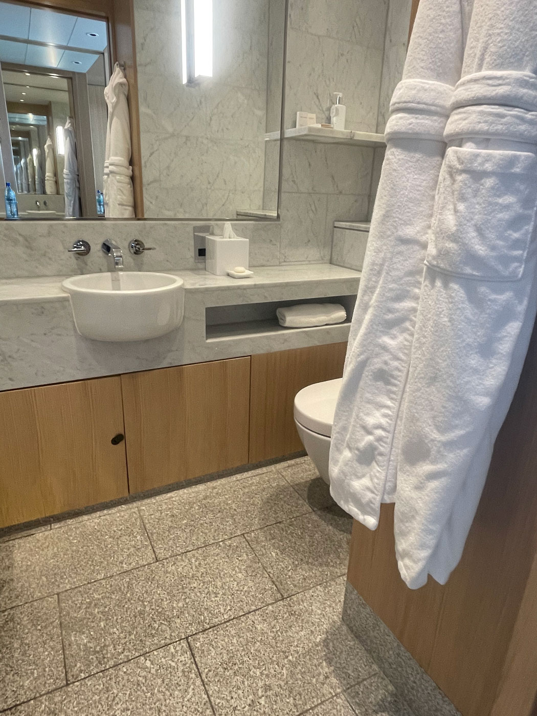 Design hotelier contemporan cum se îmbină granitul cu lemnul și marmura într-o baie elegantă