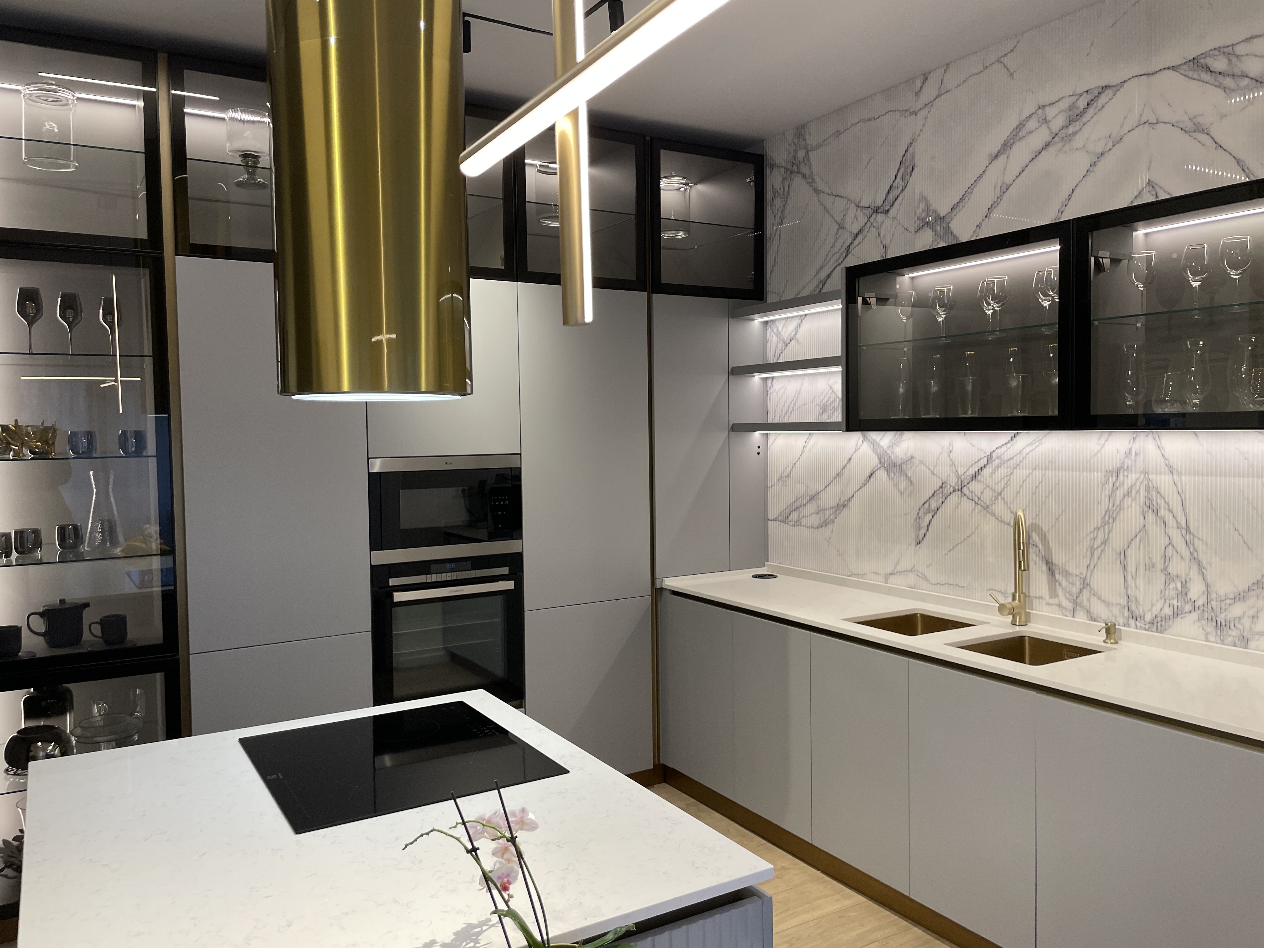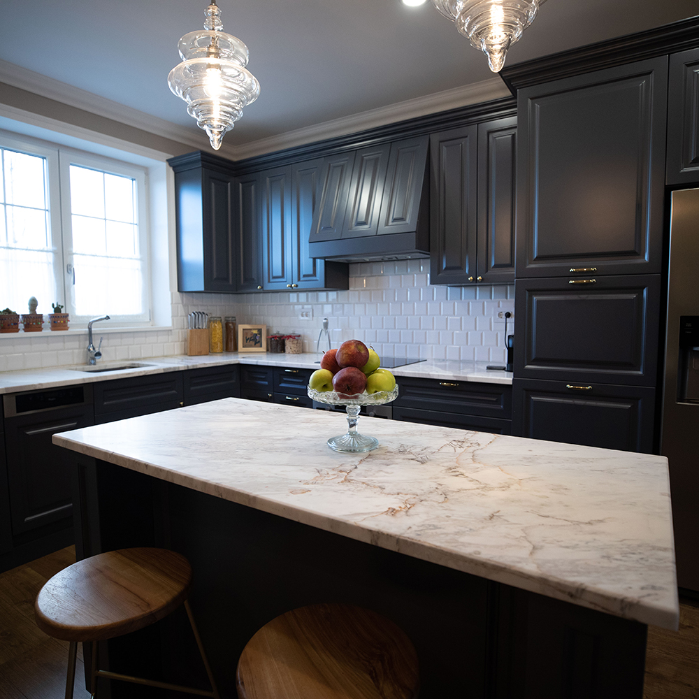 - Folosește contrastele cu măsură și creează puncte focale: Un contrast bine realizat poate da personalitate unei amenajări, însă trebuie utilizat echilibrat. Dacă v-ați îndrăgostit de o piatră cu model bogat sau culoare intensă, folosiți-o ca element de accent – de exemplu, pentru blatul unei insule de bucătărie sau pentru rama șemineului. În jurul acestui punct focal, mențineți restul finisajelor mai neutre și simple.