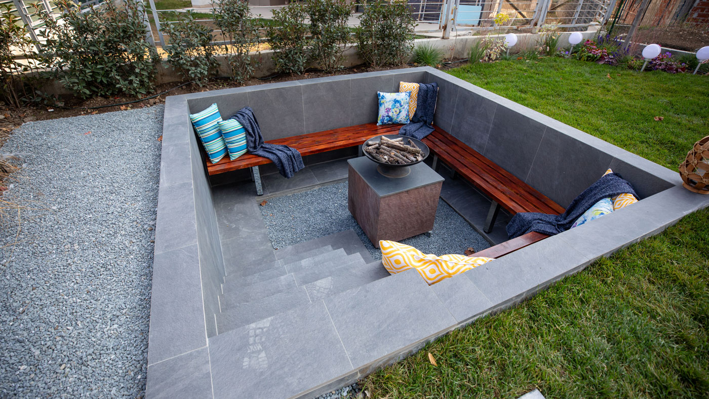 • Fire Pit în grădină – cu travertin Rock Face și deck ceramic,