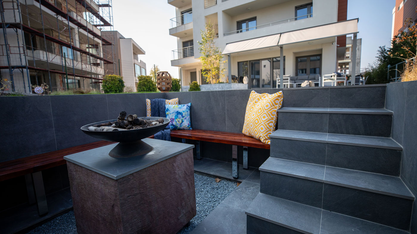 • Fire pit pe rooftop – lastre cu Rock Face pentru mascare volumetrică + mobilier de design contemporan.