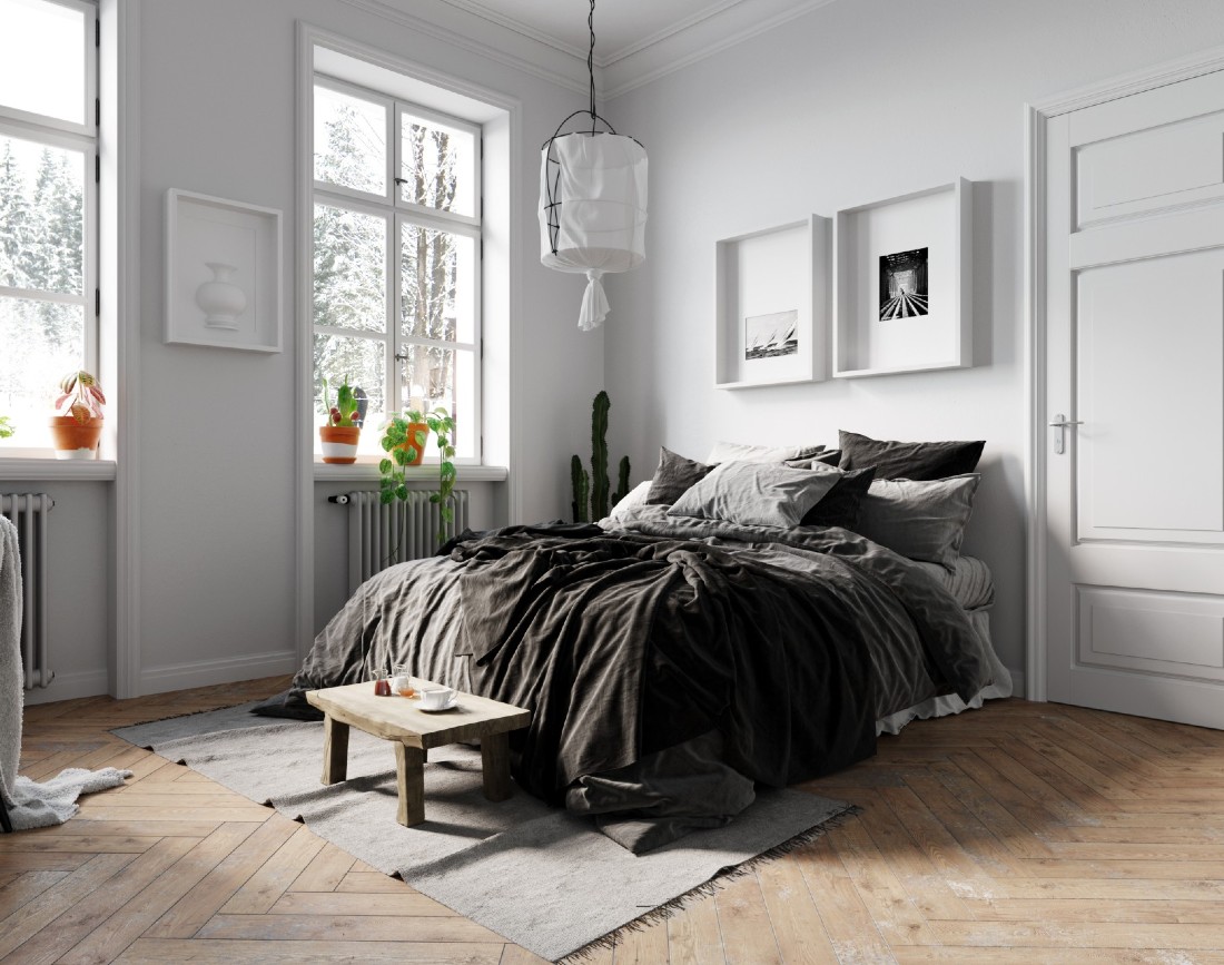 Dormitor in stil scandinav inseamna confort, spatiu mare, pereti albi si minimalism. Pentru amenajarea paroselii poti opta pentru parchet laminat, adauga tablouri sau piese de iluminat si piese de mobilier cu care sa spargi monotonia spatiului.