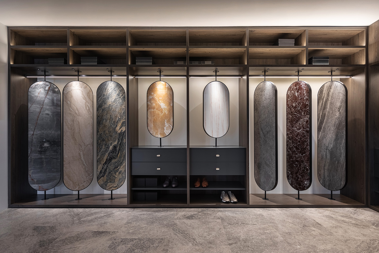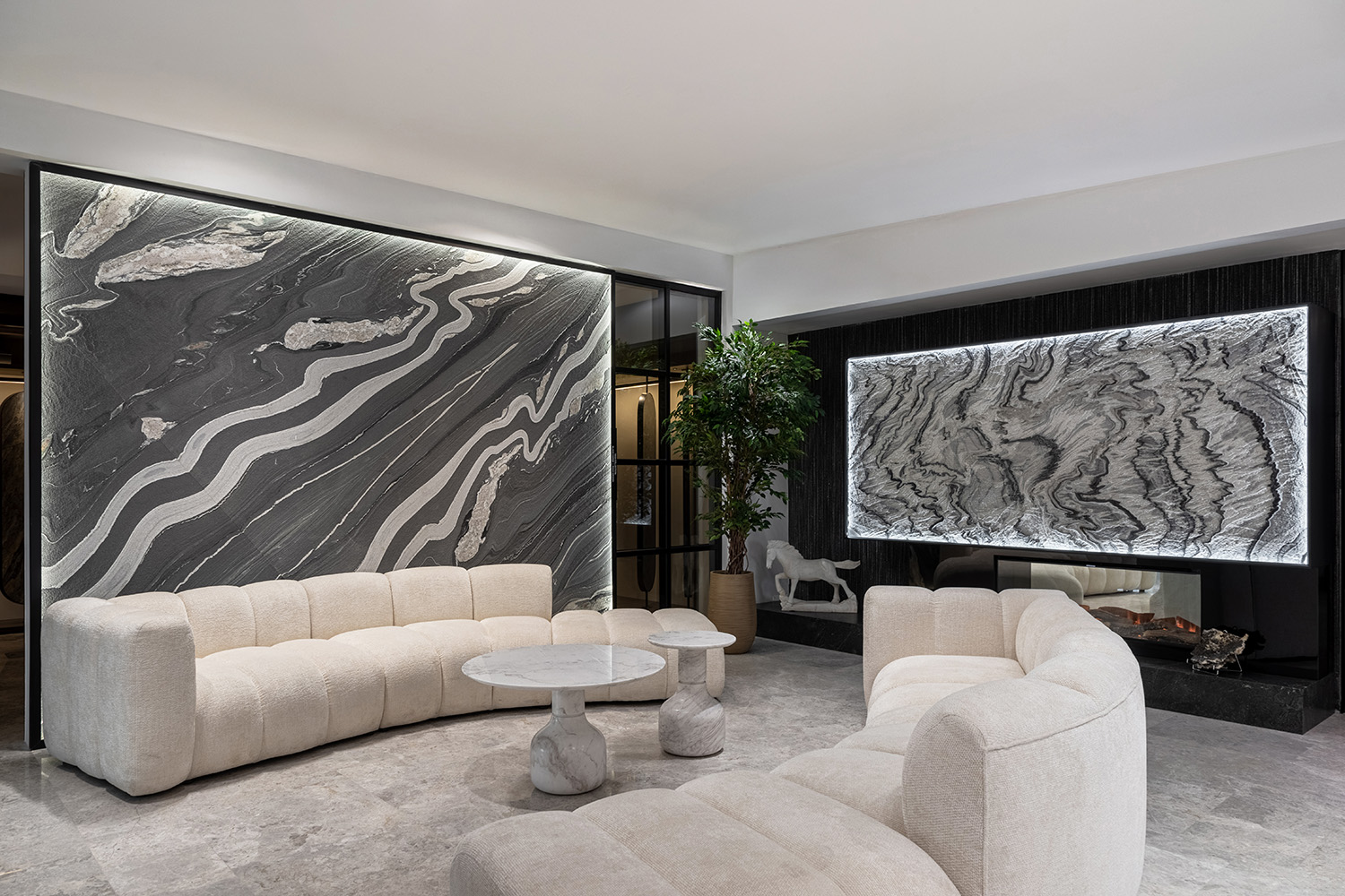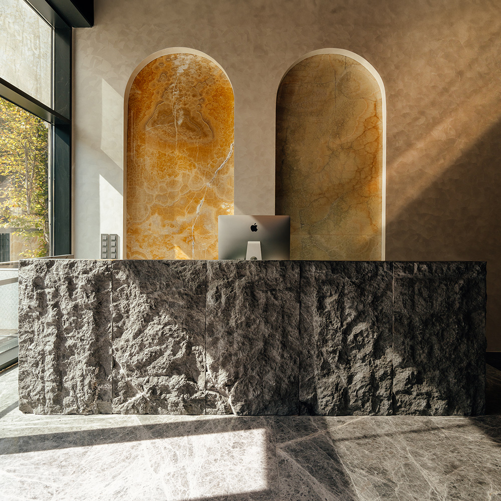 Această grijă se regăsește în fiecare detaliu al scenografiei din flagship store: materialele sunt prezentate fără etichete comerciale, iar traseele de vizitare evocă povești ale pietrei. Spațiul nu este doar demonstrativ – este transformativ.