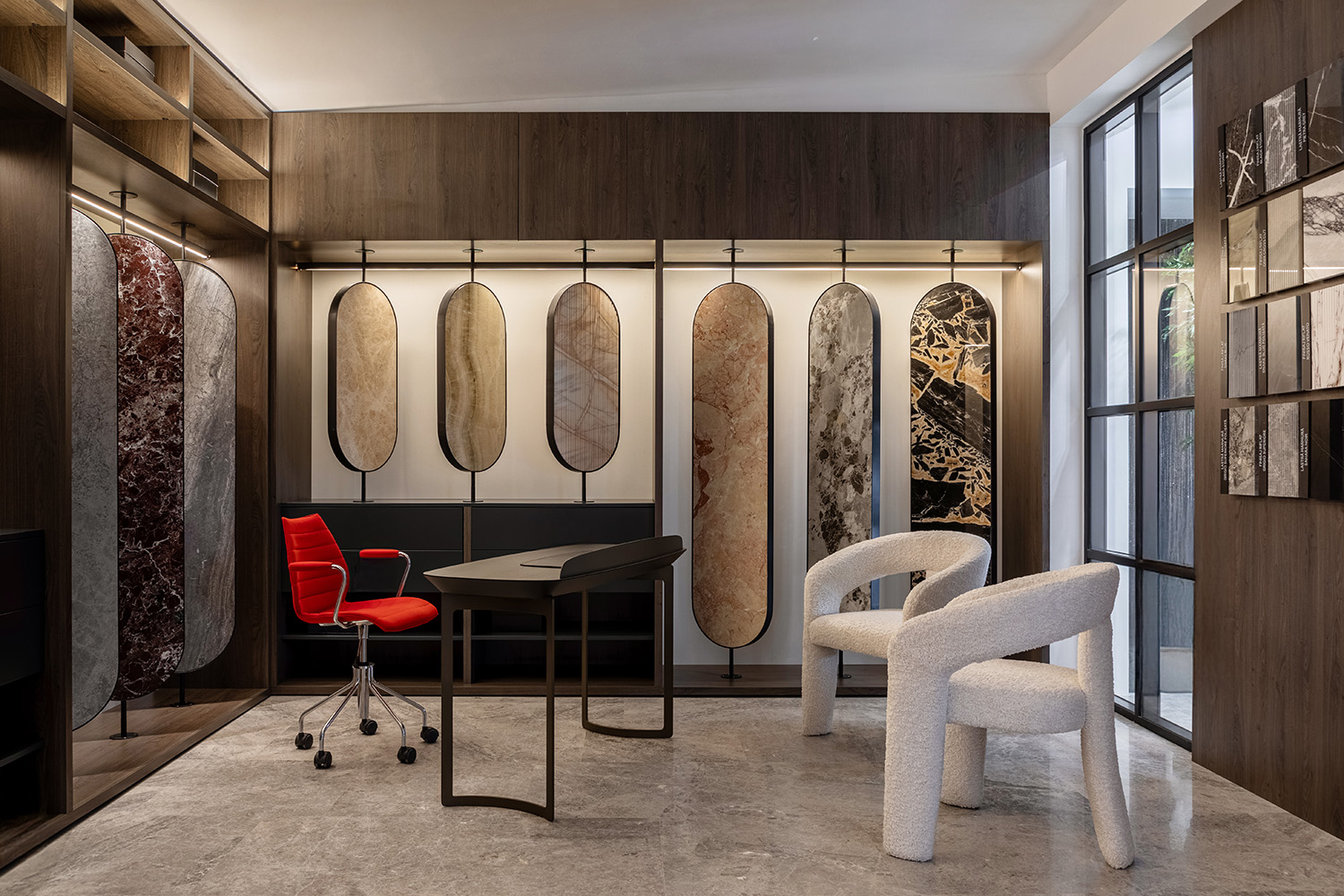 Flagship store-ul nu este un showroom obișnuit, ci o experiență curatorială completă – un spațiu în care arhitecții, designerii și clienții pot atinge, compara, testa și conecta direct cu materia. Este un model de retail care perturbă paradigma convențională de expunere, elevând rolul materialului în procesul creativ și oferind instrumente de proiectare prin biblioteci de materiale, zone tematice și texturi exclusive. Totodată, creează un adevărat laborator de idei pentru comunitatea de profesioniști.