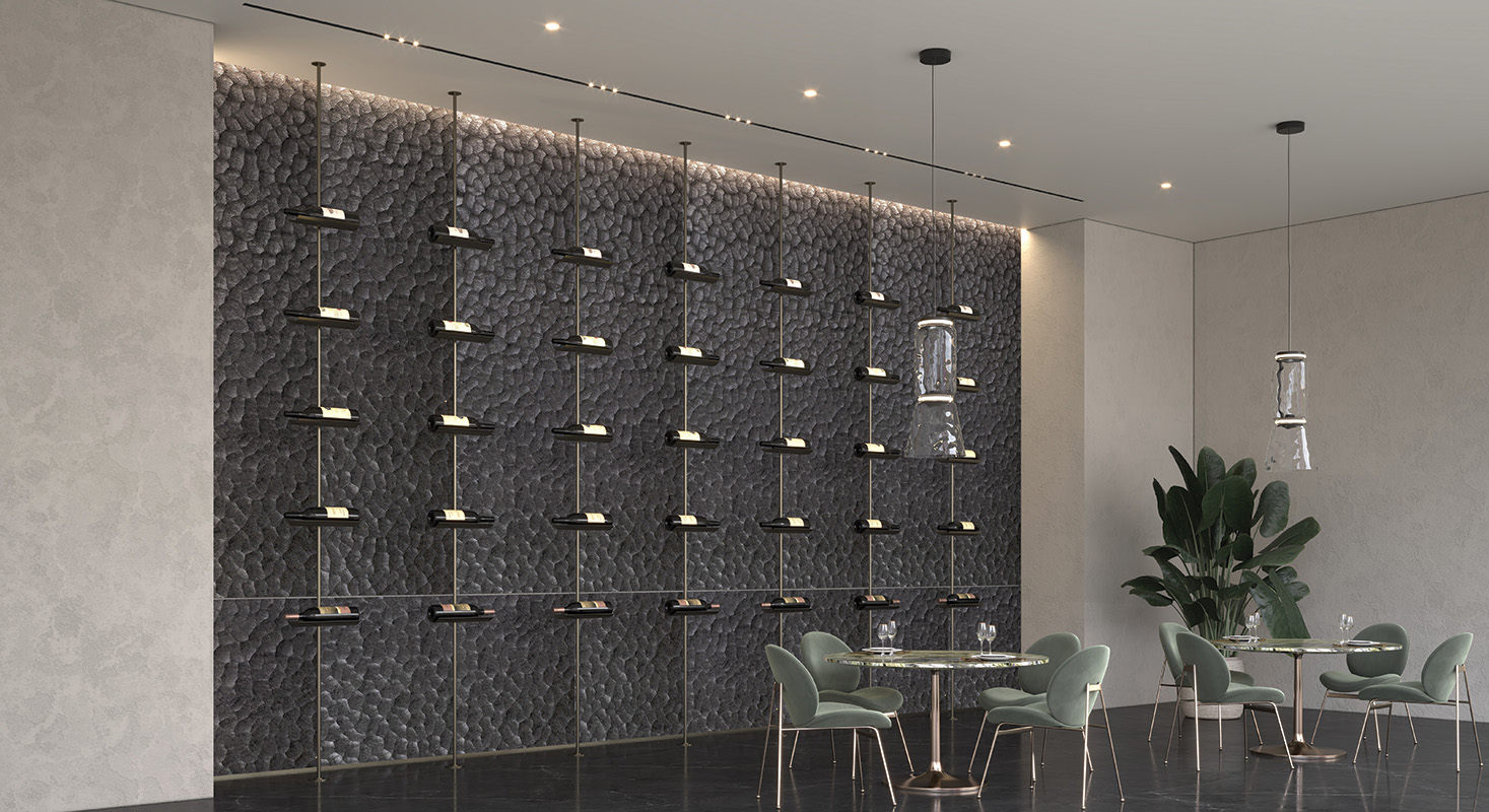 Aceste tehnici inovatoare au dat naștere unor modele distincte în cadrul colecției – de exemplu, designul Flute evidențiază șanțuri liniare elegante, Pyramid creează un relief geometric tridimensional îndrăzneț, iar Vintage conferă pietrei un aer patinat și atemporal. Fiecare textură interacționează unic cu lumina, astfel încât ambientul pare să “trăiască” și să se transforme de-a lungul zilei.