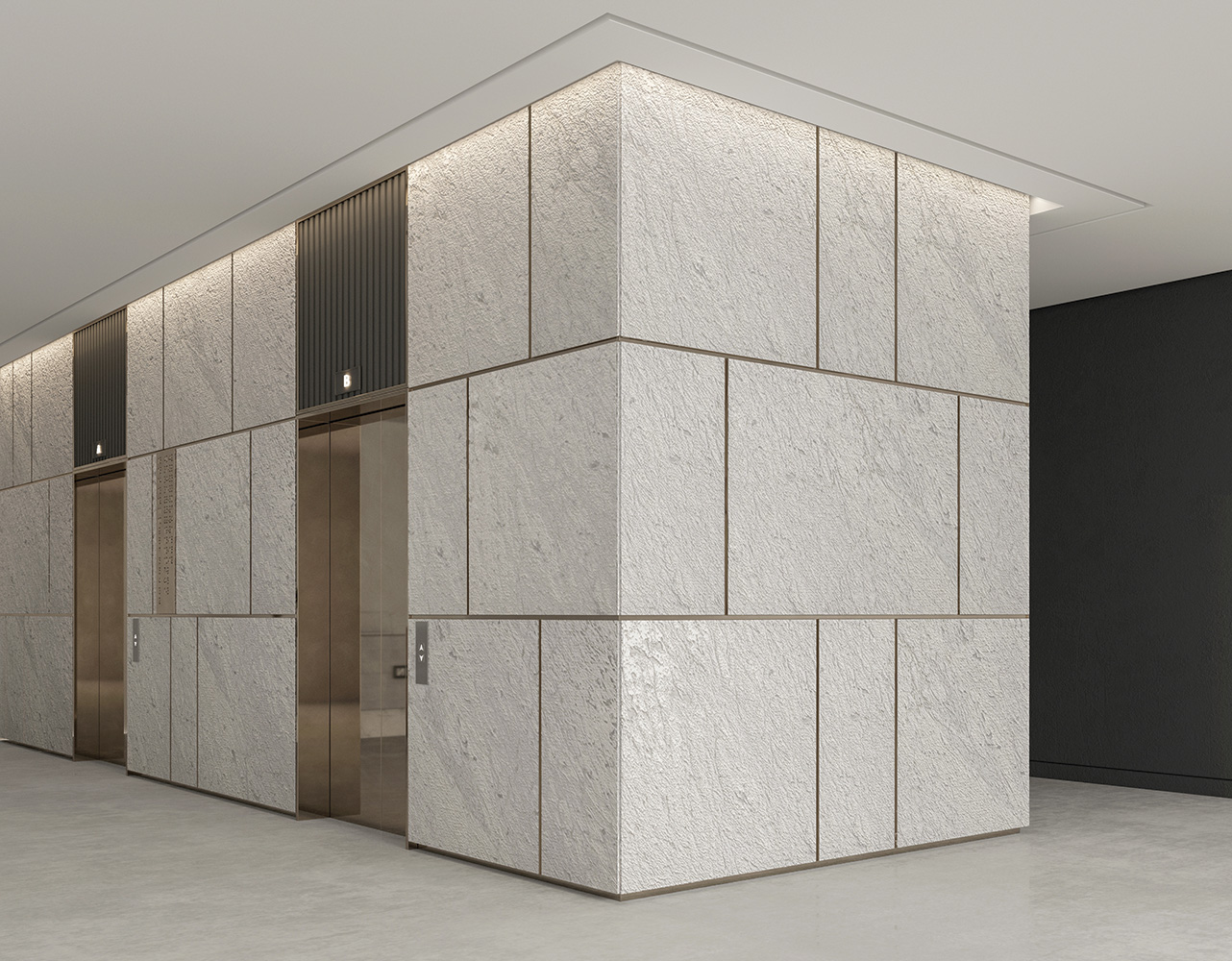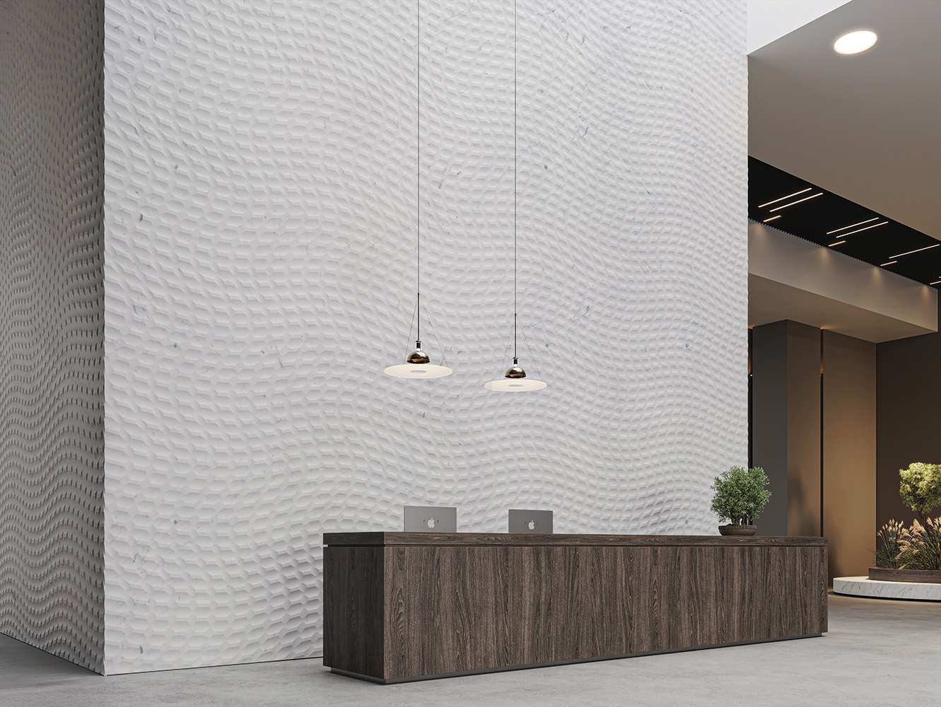 Zone de circulație cu cerințe estetice ridicate: Holurile, coridoarele și nodurile de circulație pot fi transformate în spații de impact vizual prin folosirea texturilor FLOW. Acolo unde de obicei există doar suprafețe tranzitorii, marmura sculptată adaugă un ghidaj estetic și un nivel de detaliu remarcabil, în timp ce durabilitatea pietrei asigură comportarea impecabilă în zonele cu trafic intens.
