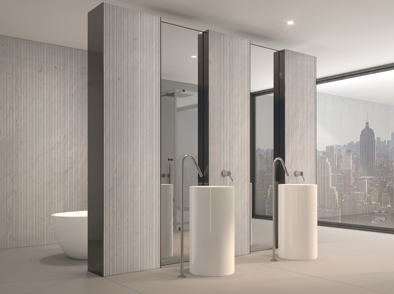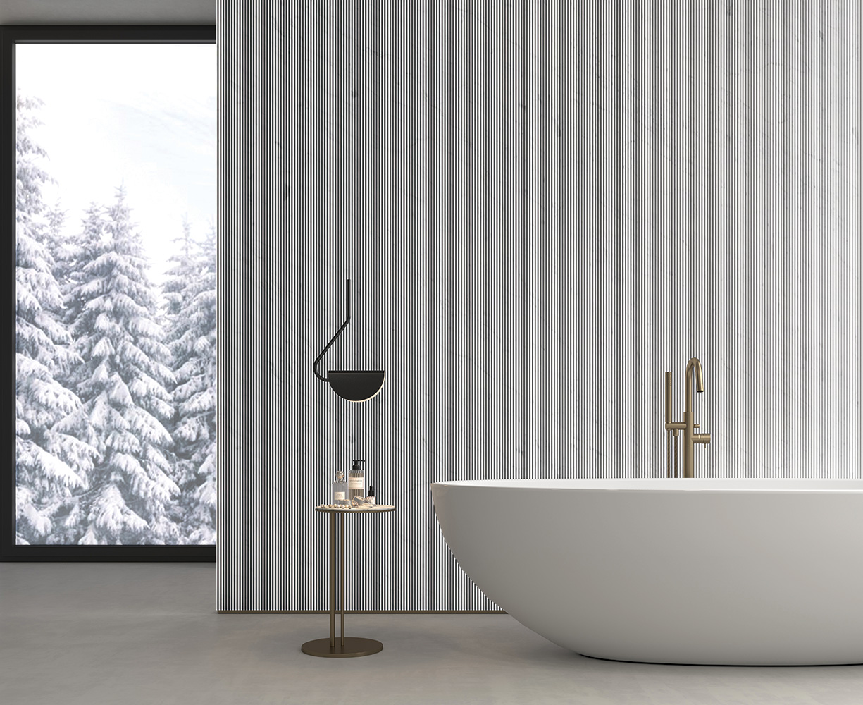 La baza colecției FLOW se află unul dintre cele mai respectate materiale din lumea arhitecturii: marmura de Carrara. Considerată neoficial cea mai faimoasă marmură din lume, aceasta a fost materialul preferat al sculptorilor de-a lungul secolelor pentru puritatea minerală și eleganța sa desăvârșită. Aleasă pentru structura ei cristalină stabilă și pentru venaturile subtile, marmura Carrara oferă platforma perfectă pentru prelucrări sculpturale complexe. Este o piatră care nu doar acceptă textura, ci o amplifică: sub modelările tridimensionale ale colecției, marmura capătă profunzimi noi, jocuri vibrante de lumină și umbră, și o vibrație vizuală imposibil de replicat cu orice alt material. Prin folosirea Carrara ca bază, FLOW își ancorează identitatea în tradiția materialelor nobile, proiectând-o totodată într-o estetică radical contemporană.