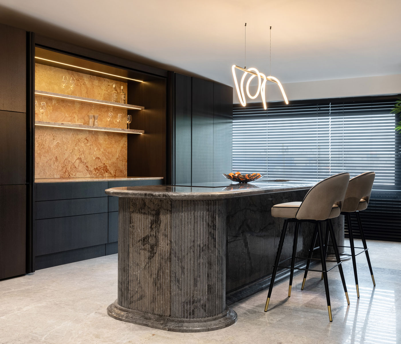 În plus, prelucrarea și finisajele personalizate – de la muchii rotunjite la texturi speciale – permit integrarea pietrei naturale în concepte de design sofisticate. Barurile curbate, plintele aurii și accentele din lemn creează un joc subtil între modern și clasic.