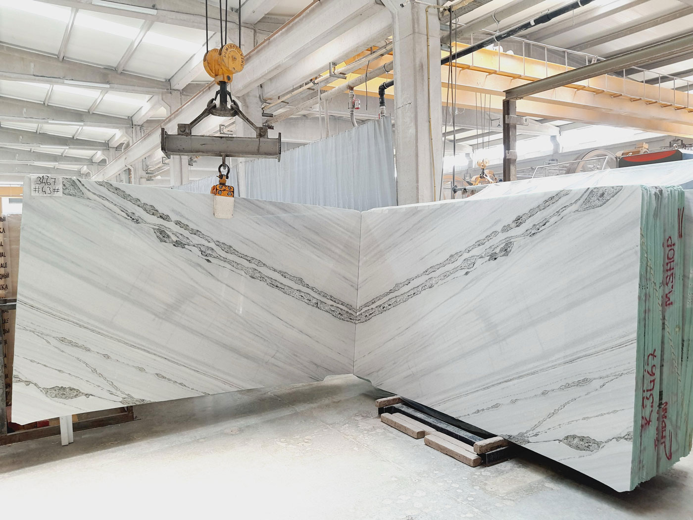 Dar cum se realizează debitarea precisă a marmurei pentru un astfel de proiect? Cum sunt transformate lastrele brute în plăci poligonale care se îmbină perfect? Haideți să explorăm procesul pas cu pas.