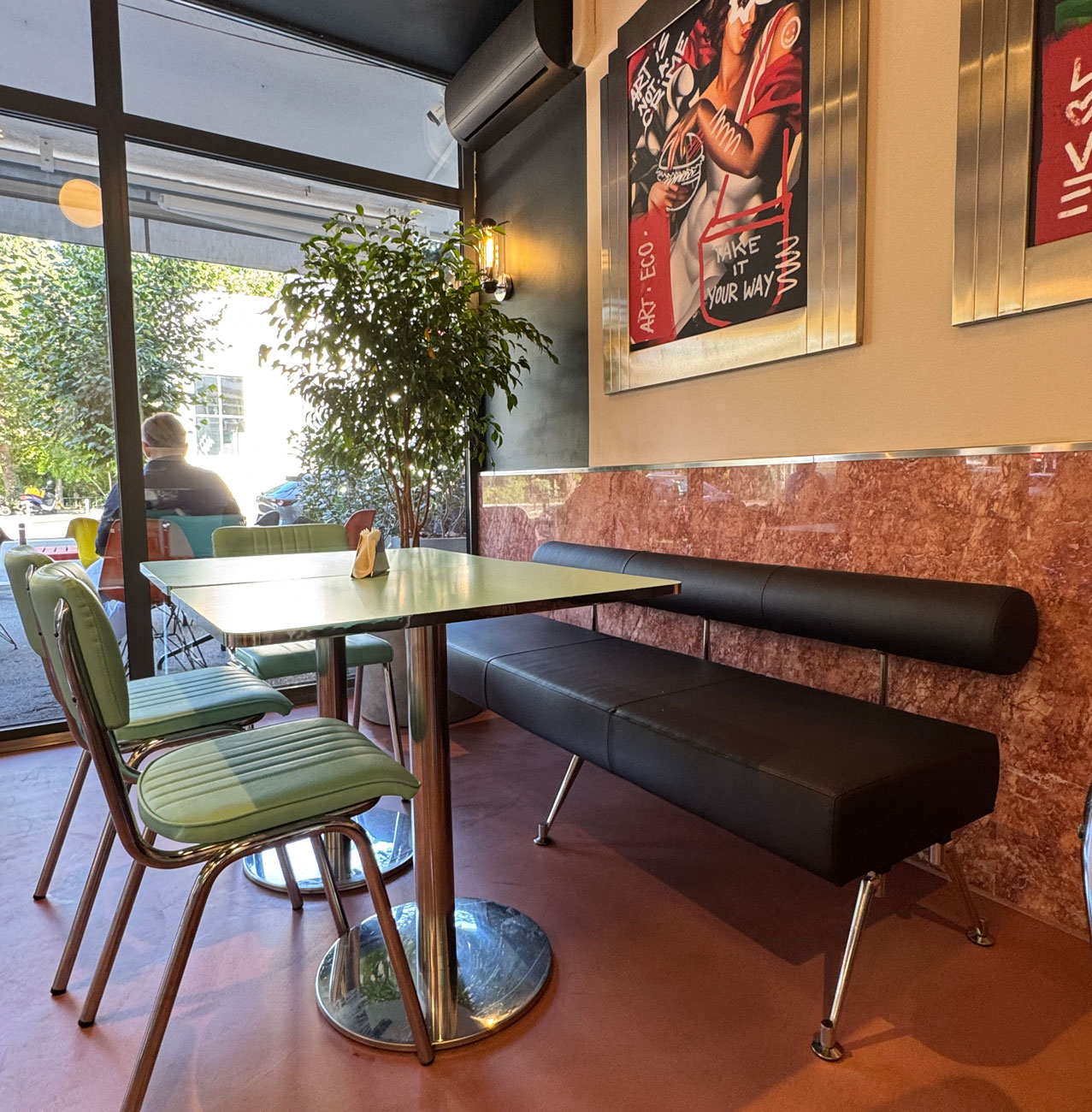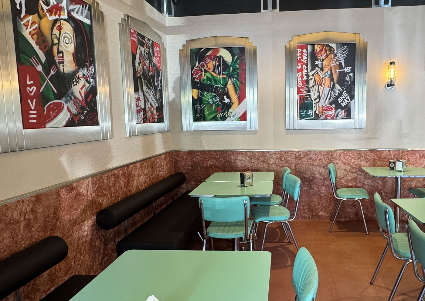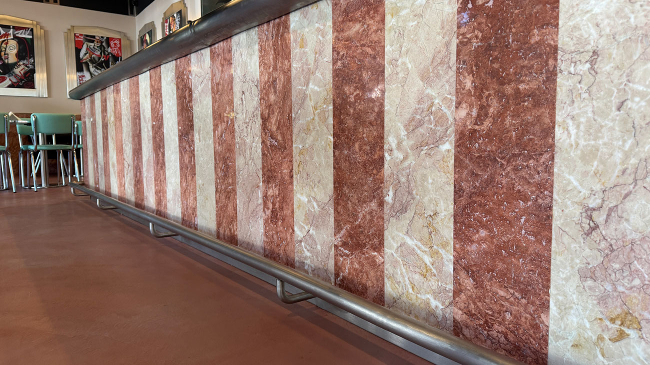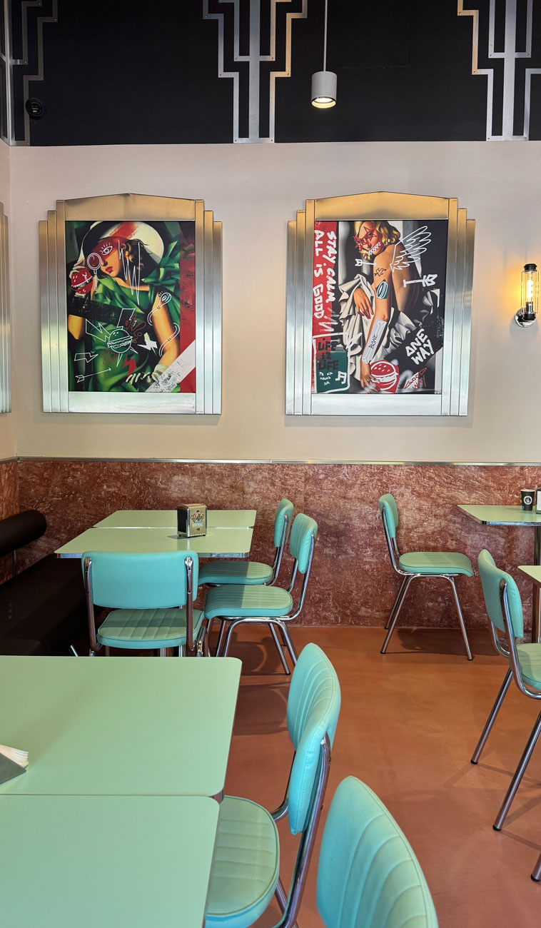 NY Bagels & Burgers | #NYBB reflectă viziunea conceptului: un vibe de diner american cu accente Art Deco, mese înalte și scaune rotunde tip bar, pereți decorați cu motive geometrice și postere pline de culoare. Barul și o parte a pereților sunt placate cu benzi verticale din travertin Opium Red și marmură Pink Aurora, alternând nuanțe de roșu intens și roz pudrat. Aceste texturi naturale bogate – travertinul roșu cu vene dramatice și marmura roz delicată – lovesc vizual privitorul de cum intră, conferind spațiului o identitate unică. În contrast, blatul de bar din inox lustruit și elementele metalice aduc strălucirea modernă specifică anilor ’30. Iluminatul retro, cu lustre ce amintesc de filmele noir, și tablourile reinterpretate (figuri renascentiste ținând burgeri în loc de fructe) completează atmosfera ludic-elegantă. Rezultatul este un interior care te invită să rămâi ore în șir, cufundat într-o experiență cinematografică și culinară deopotrivă.