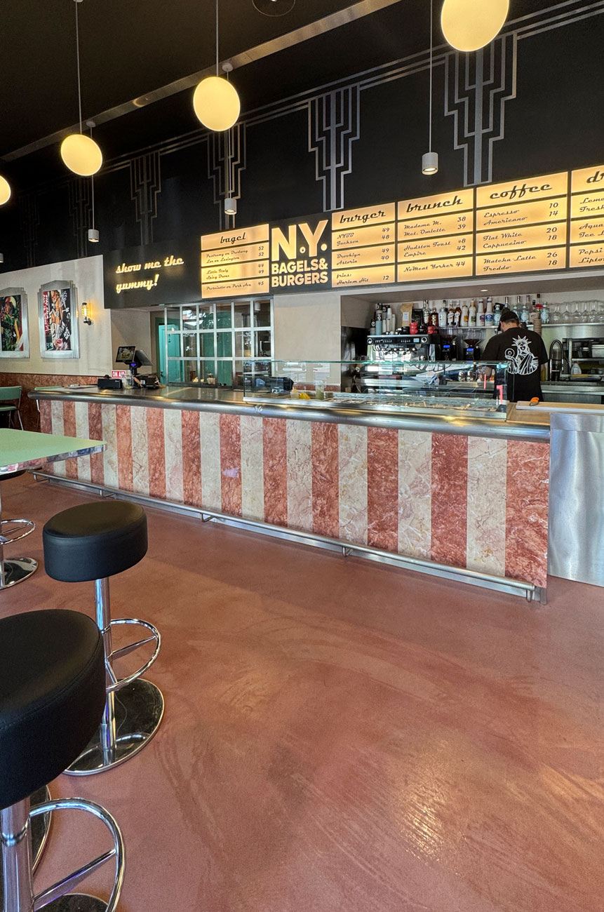 În Calea Floreasca din București a apărut recent un local care aduce în inima orașului energia vibrantă a New York-ului. Proiectul NY Bagels & Burgers (#NYBB) îmbină atmosfera diner-elor americane cu eleganța atemporală a designului Art Deco, totul prin prisma materialelor naturale spectaculoase furnizate de PIATRAONLINE. Cu o abordare super-inspirațională, acest cover story prezintă povestea amenajării și echipa din spatele ei, evidențiind rolul pietrei naturale în concept și oferind un set de întrebări pentru arhitecții creatori.