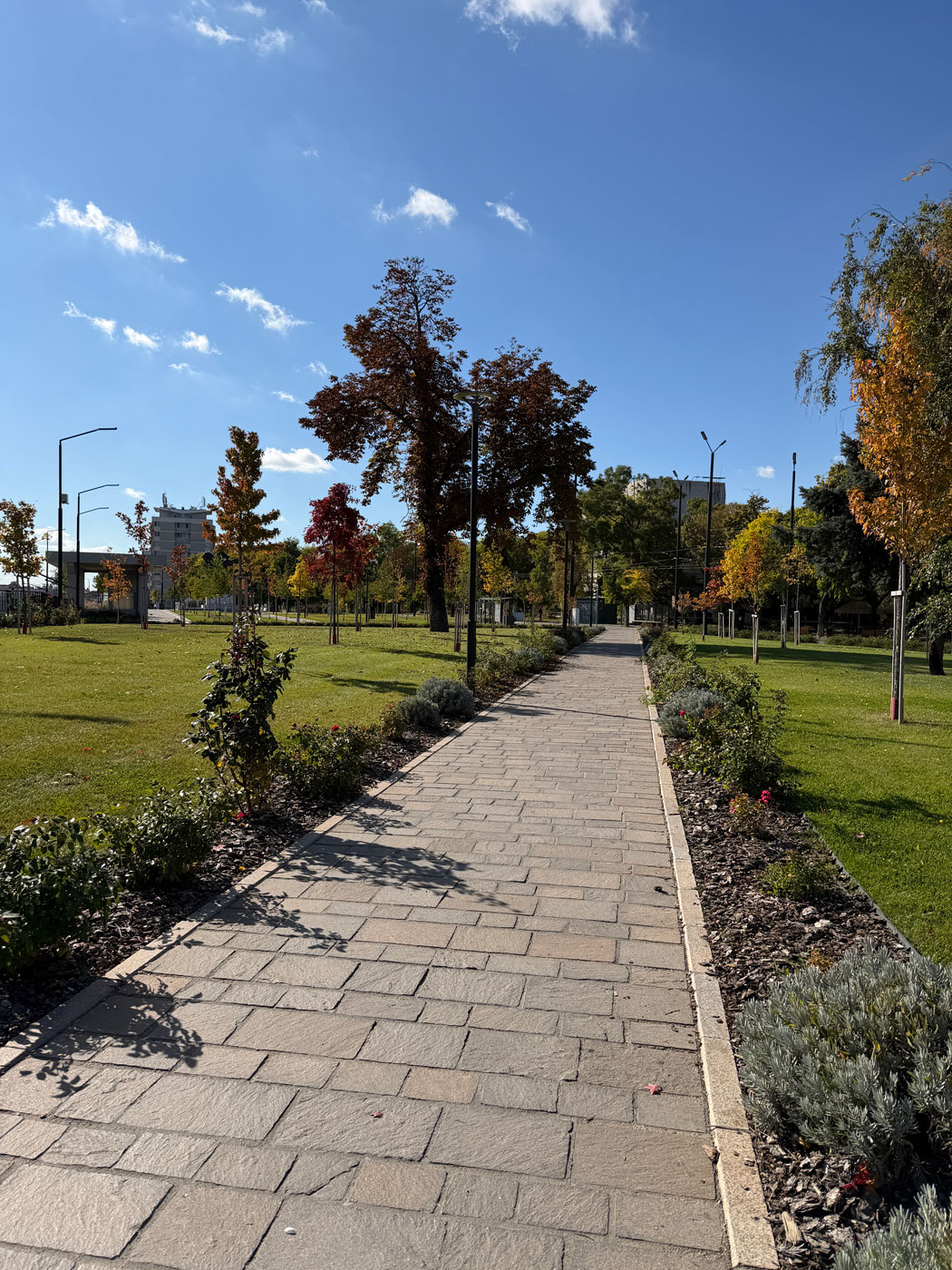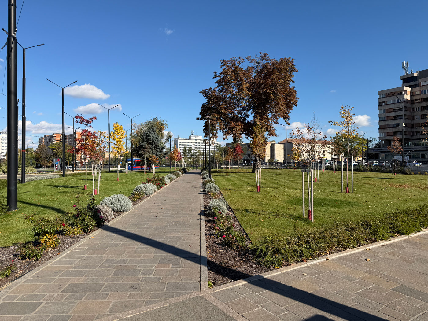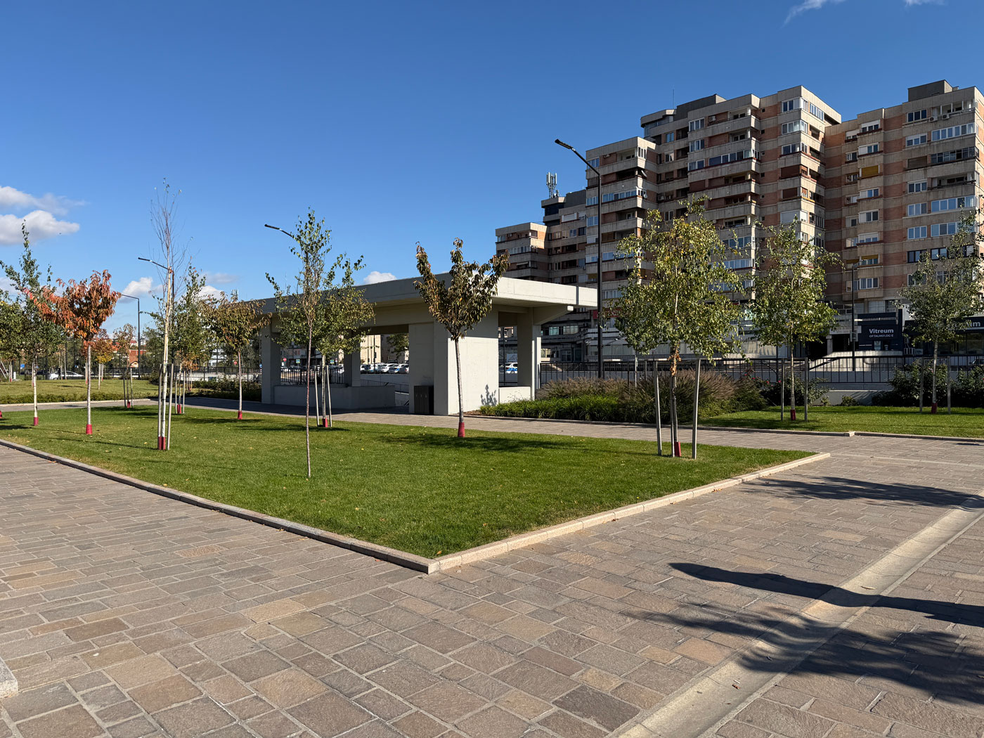 Deasupra parcării subterane a prins contur o piațetă urbană generoasă, gândită ca spațiu public pietonal și de relaxare. Întinzându-se pe aproape 7.000 mp , noua amenajare leagă puncte importante ale orașului – Piața Unirii, Parcul 1 Decembrie și Cetatea Oradea – integrând centrul istoric într-un traseu pietonal coerent . Transformarea este cu adevărat remarcabilă: o zonă care înainte era dominată de șosele aglomerate și terenuri de parcare la suprafață a devenit acum un loc de promenadă atractiv, cu alei largi pavelate, arbori și spații verzi, mobilier urban și elemente decorative moderne. Piațeta este dotată cu iluminat public ambiental, bănci și pergole care creează zone umbrite, precum și jardiniere cu plante perene, graminee și arbuști ornamentali, totul pentru a oferi un ambient plăcut atât locuitorilor, cât și turiștilor .