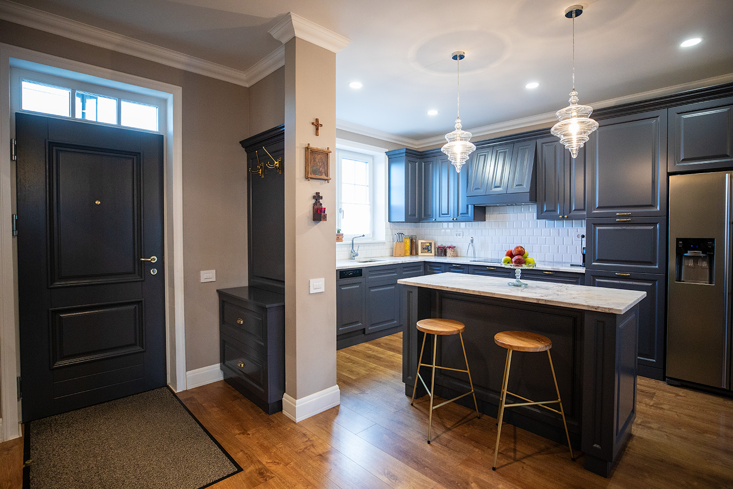 Blaturile de bucătărie sau baie confecționate din piatră naturală impun și ele o atenție specială la grosime. Marmura, granitul sau quartzitul folosite pentru blaturi vin de obicei în plăci standard de 2 cm sau 3 cm grosime – acestea fiind dimensiunile cel mai des întâlnite în industrie. Un blat de 2 cm grosime poate fi întărit prin dublarea cantului (pentru un aspect masiv) sau printr-o susținere suplimentară în structura mobilierului, pe când un blat de 3 cm oferă, în general, suficientă rezistență de sine stătătoare. În proiectele exclusiviste se pot folosi și grosimi mai mari: de pildă, o insulă de bucătărie cu aspect monolit poate avea un blat de ~5 cm, obținut prin lipirea a două plăci mai subțiri, însă greutatea devine considerabilă. Esențial este ca mobilierul sau structura de suport să poată susține greutatea unui blat din piatră, mai ales la grosimi peste media obișnuită, pentru a garanta siguranța în utilizare.