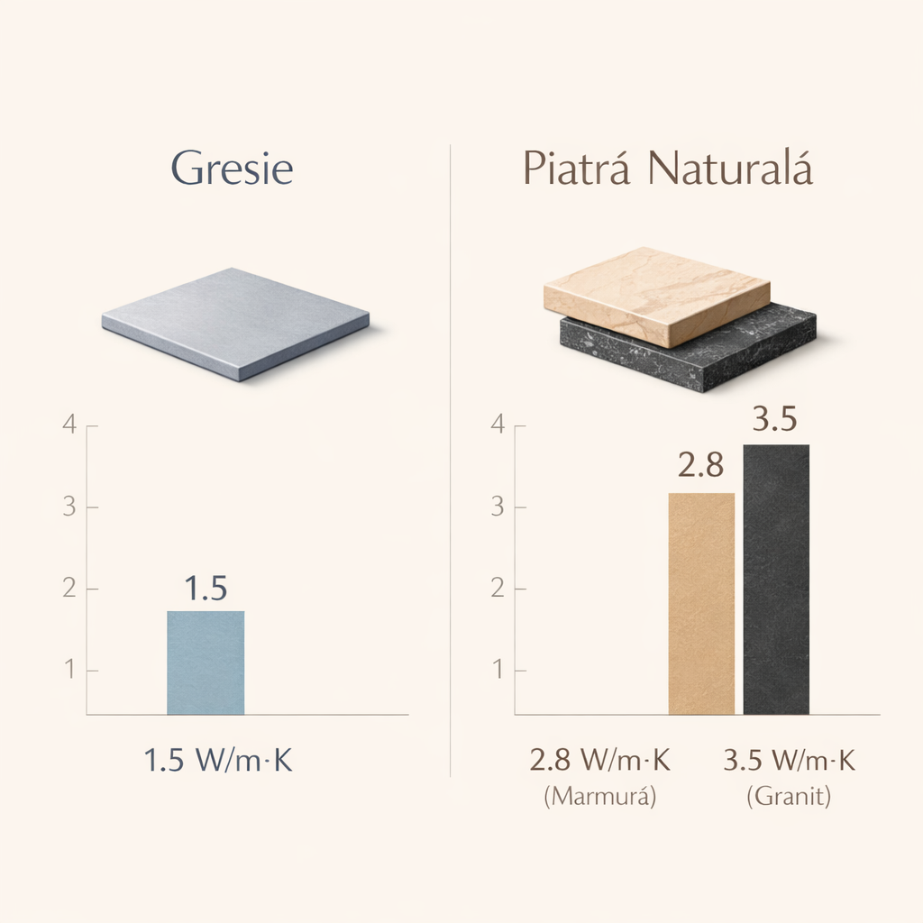 Concluzia din tabel este clară și neechivocă: marmura conduce căldura de 1,8 ori mai bine decât gresia arsă standard, iar granitul o conduce de 2,3 ori mai bine. Aceasta nu este o diferență marginală — este o diferență de categorie.