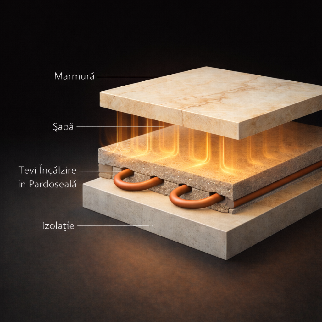 Există o lecție simplă pe care fizica o confirmă și pe care corpul uman o trăiește zilnic: confortul la picioare nu depinde doar de valoarea temperaturii setate pe termostat, ci de modul în care materialul o transmite, o distribuie și o menține. Gresia arsă și faianța sunt materiale competente tehnic, cu locul lor bine definit în bucătărie sau în băile utilitare. Dar în spațiile unde locuim cu adevărat — livingul, dormitorul, baia de relaxare — diferența pe care o face o pardoseală din marmură sau granit pe un sistem de încălzire nu este resimțită ca o cifră pe un termometru. Este resimțită ca senzația că spațiul te primește, nu că te supune. Această diferență, măsurabilă în W/m·K, se traduce zi de zi în calitatea experienței de a trăi în acel spațiu.