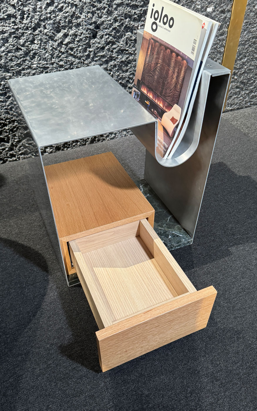 Wave nu este o piesă comodă. Nu urmărește „ce se cere”, ci explorează ce ar fi posibil dacă îmbini trei materiale fundamental diferite – piatră naturală, lemn și metal – într-un singur obiect sculptural.