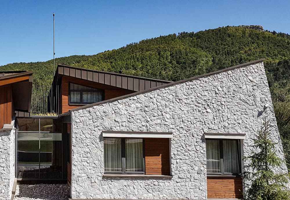 soclu din piatră decorativă exterior protejează partea cea mai expusă a clădirii și închide vizual volumul.
