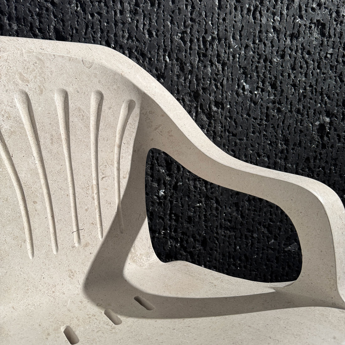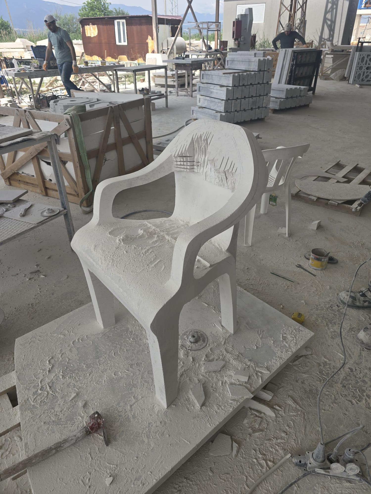 Un scaun de plastic are o geometrie extrem de complexă: nervuri, curbe cu raze variabile, grosimi diferite pe același element, goluri structurale, tranziții subtile între plan și volum. A reproduce această geometrie în piatră naturală nu este un exercițiu de artizanat — este o problemă de inginerie aplicată la sculptură. Atelierul PIATRAONLINE a combinat prelucrarea CNC pentru geometriile de bază cu finisarea manuală pentru detaliile de suprafață, obținând un obiect în care fiecare curbă a originalului din plastic este prezentă — dar tradusă în textura și greutatea marmurii. Piatra păstrează imperfecțiunile intenționate ale matriței originale: urmele de fabricație industrială, liniile de turnare, geometria standardizată a unui produs de serie. În marmură, toate acestea devin altceva.