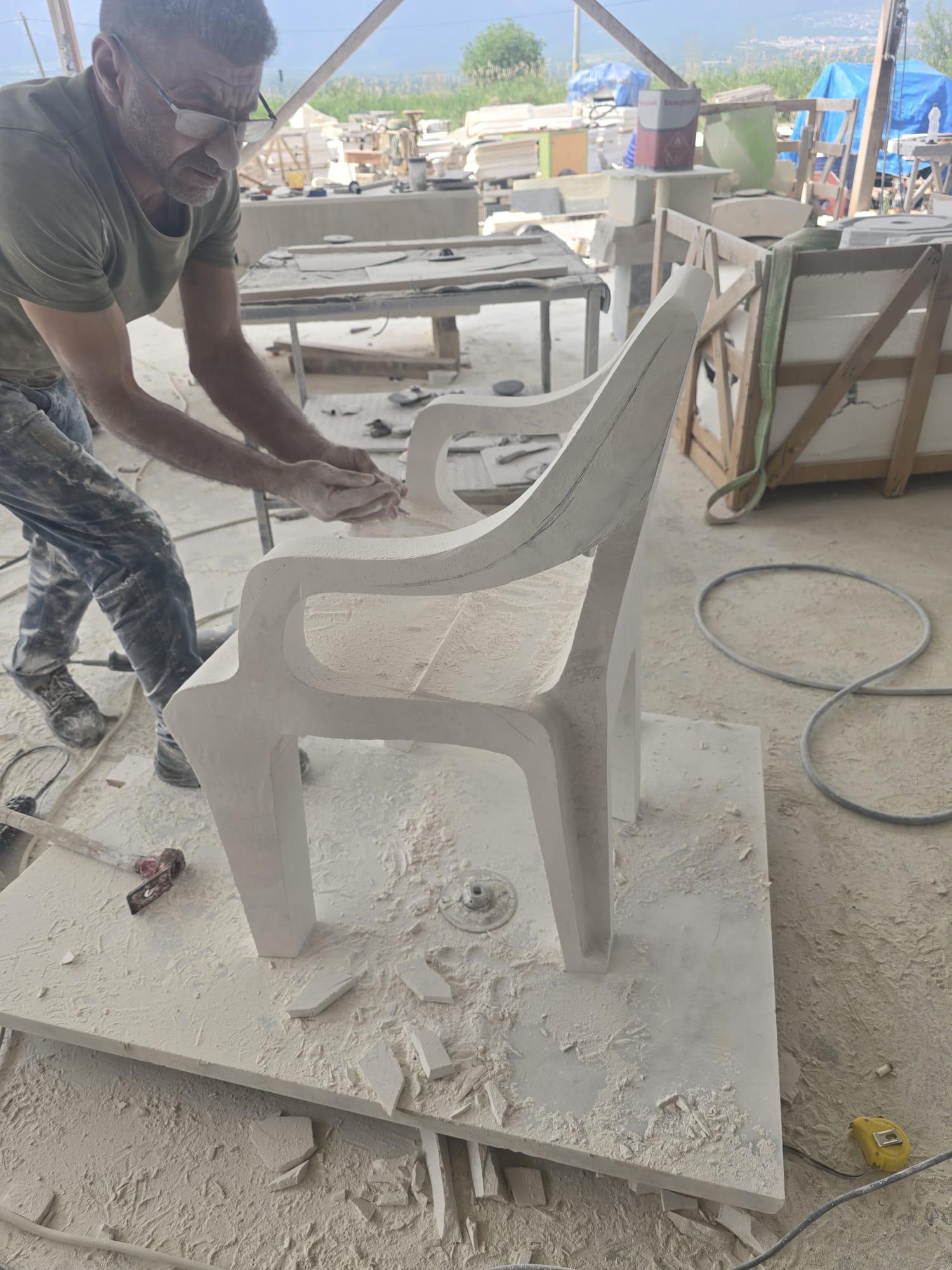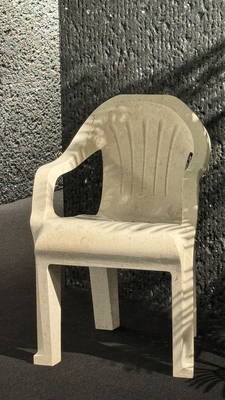 Cristian Corvin a ales să sculpteze exact acest obiect în piatră naturală — și alegerea nu este ironică, nu este nostalgică și nu este decorativă. Este filosofică. Prin transpunerea unui obiect efemer într-un material care durează milenii, designerul pune o întrebare simplă și incomodă: ce merită să rămână? Ce din ceea ce am trăit, am folosit, am aruncat și am uitat merită să fie transformat în permanență? Piatra nu minte și nu înfrumusețează — ea fixează. Iar a fixa forma unui scaun de plastic în marmură înseamnă a decide că acea formă, acea memorie, acea epocă merită să nu fie uitată. Nu glorificată — fixată. Există o diferență.