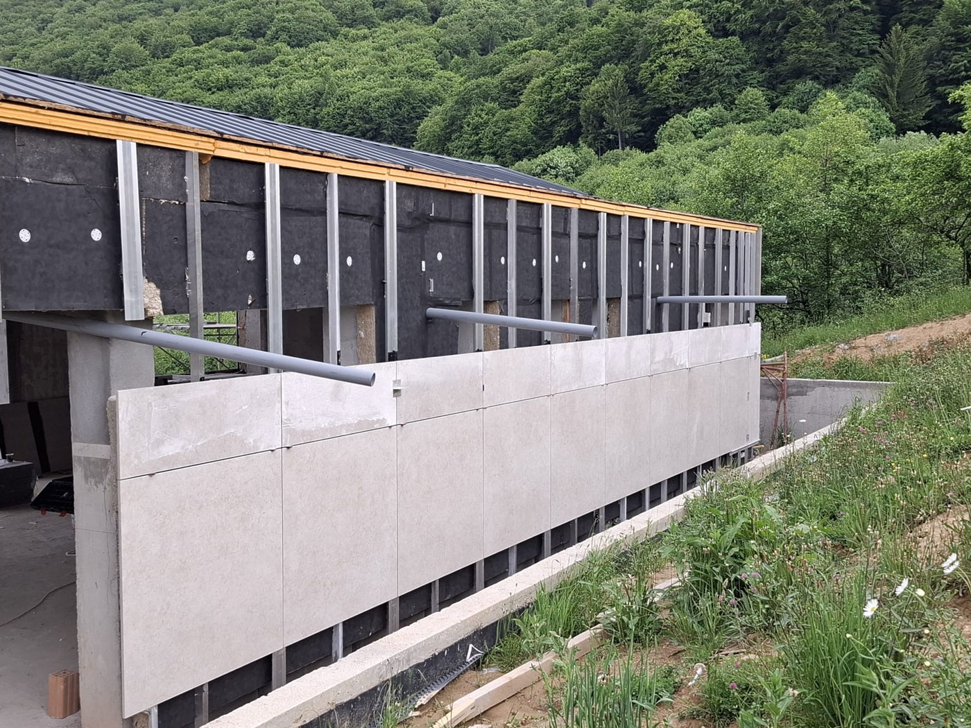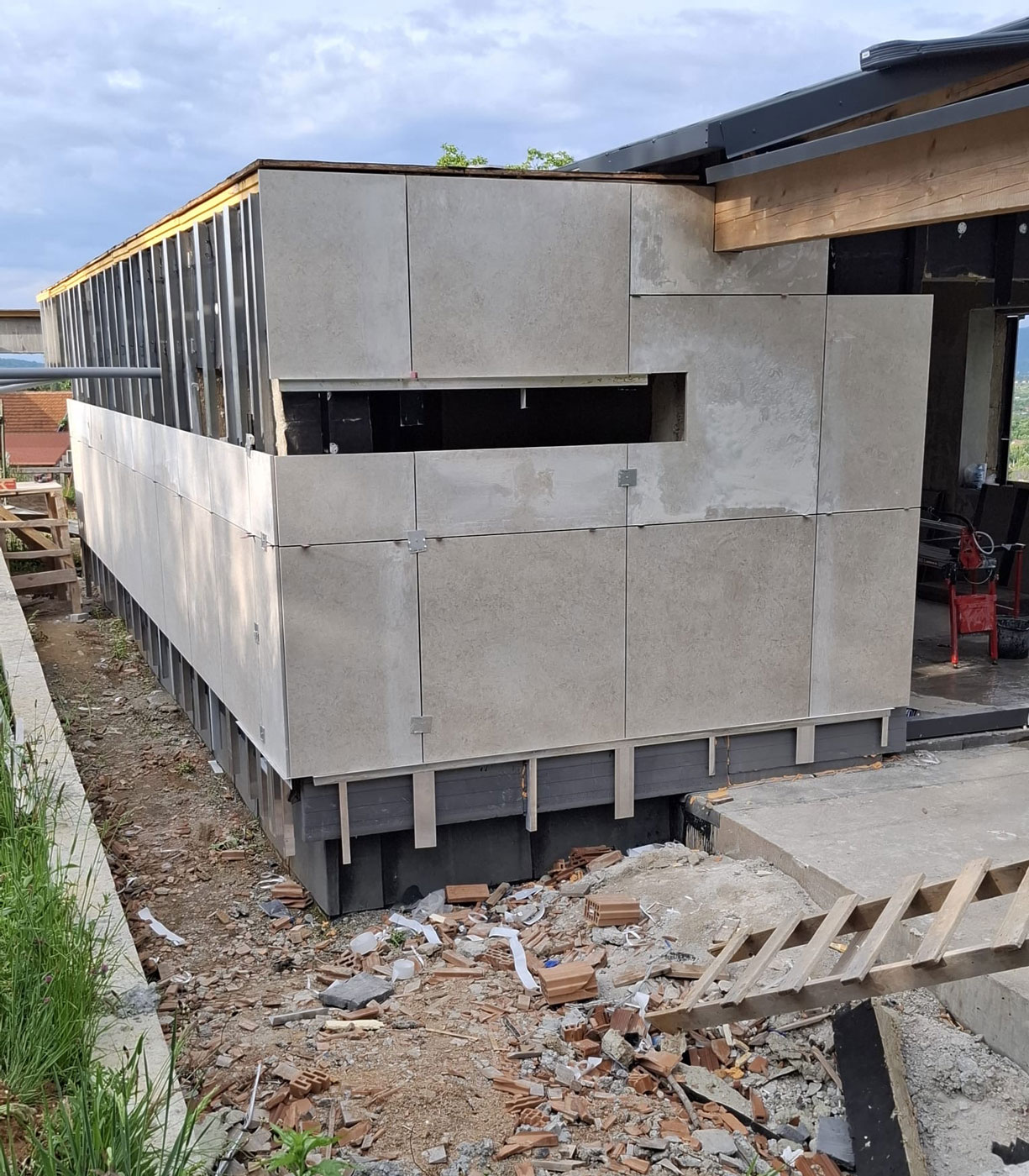 Sistemele de fațadă ventilată (profile aluminiu ETEM) permit prinderea mecanică, disiparea umidității, protecție termică și stabilitate dimensională. Combinarea plăcilor sinterizate cu structuri ETEM oferă libertate de design (formate mari, secțiuni plane), plus eco-eficiență și durabilitate.