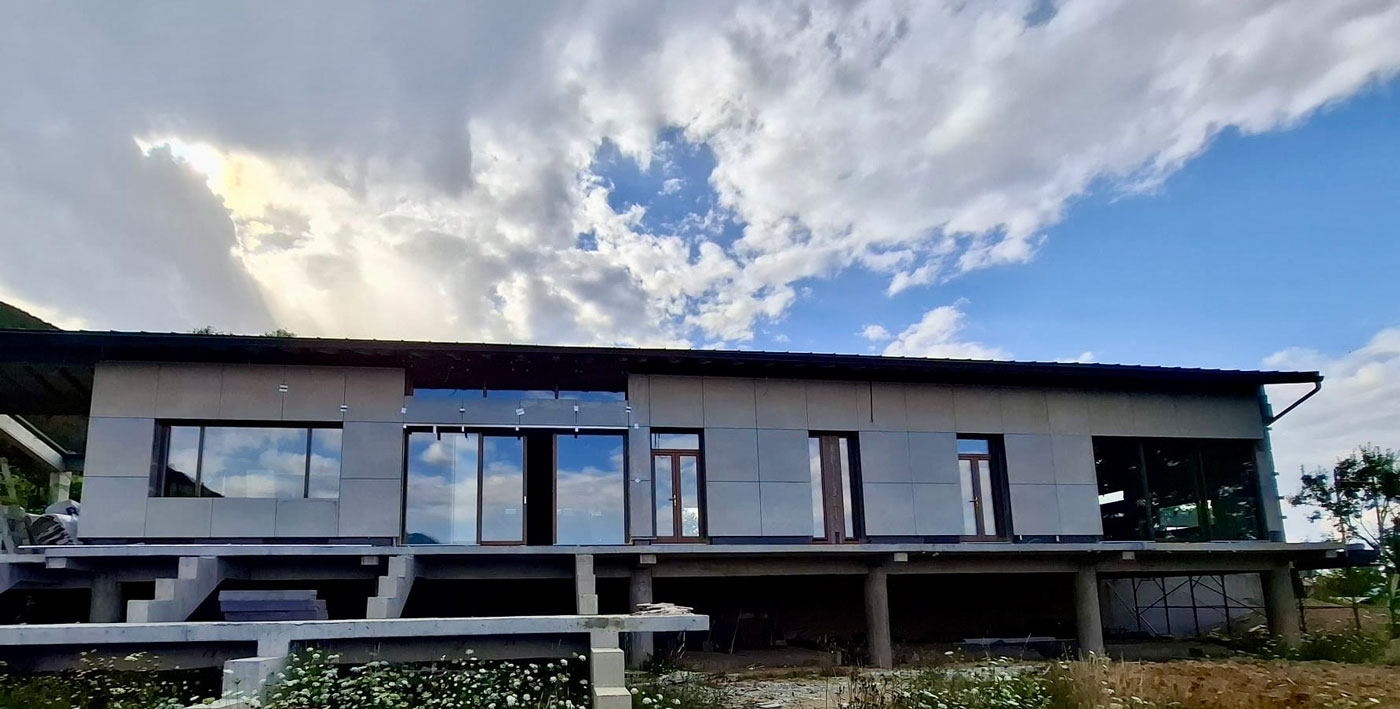 Gândirea proiectului a vizat linii simple, deschideri mari către natură, lățimi generoase de terasă, dar și materiale care să reziste la intemperii, cu întreținere redusă. Alegerea piatra sinterizată Colosseo Pietra di Gerusalemme: culoare caldă, nuanțe de piatră naturală, textura fidelă, dar tehnologie modernă – grosimi de 2 cm, variante mari de format (120×120, 120×240), finisaje antiderapante (R11) potrivite pentru exterior. Importanța colaborării directe cu furnizorul: nu doar livrare de material, ci consultanță tehnică pentru montaj, selecție de format, aliniament estetic și funcțional, detalii precum rosturi, fixări, adaptare la sarcini climatice.