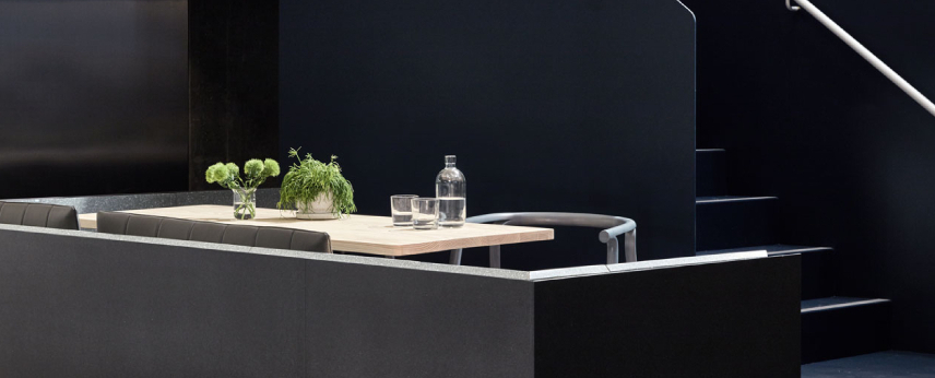 Blatul pentru insula de lucru este din steatit si este un material folosit in prezent pentru prepararea mancarii sau in amenajarea spatiilor Horeca, provenind dintr-o cariera din Quebec. Steatitul era folosit pe vremuri in laboratoare, iar rezistenta sa la socurile termice l-au transformat in materialul ideal care sa reziste la o temperatura de -196 de grade Celsius provocata de azot. Si in acest proiect, caramida este cea ca conserva istoria locului si o duce mai departe intr-un altfel de spatiu.