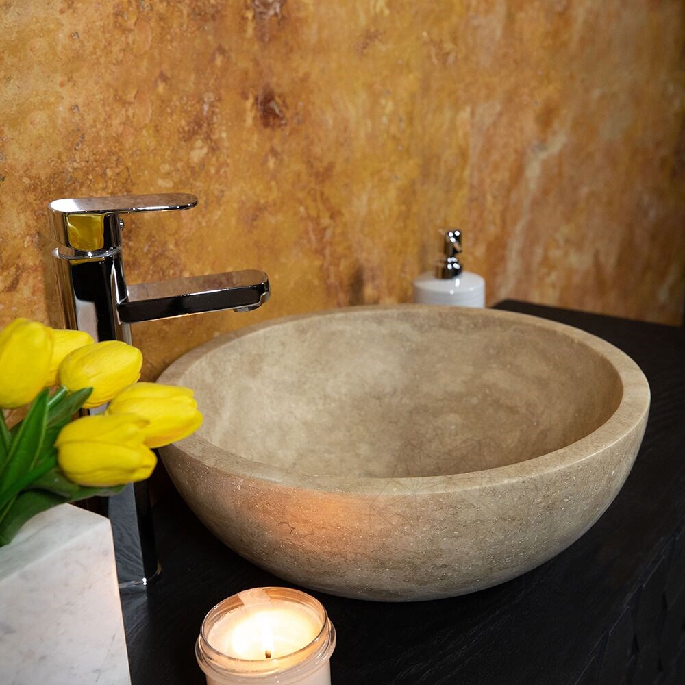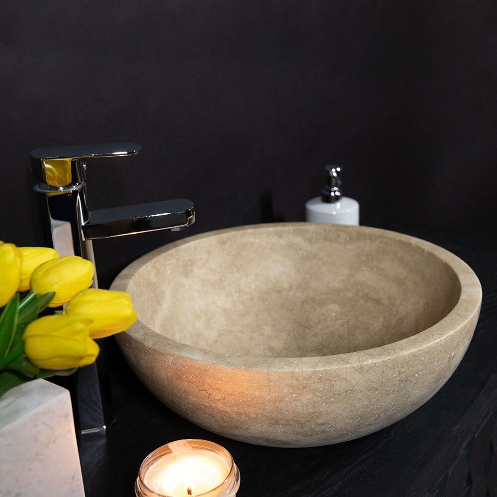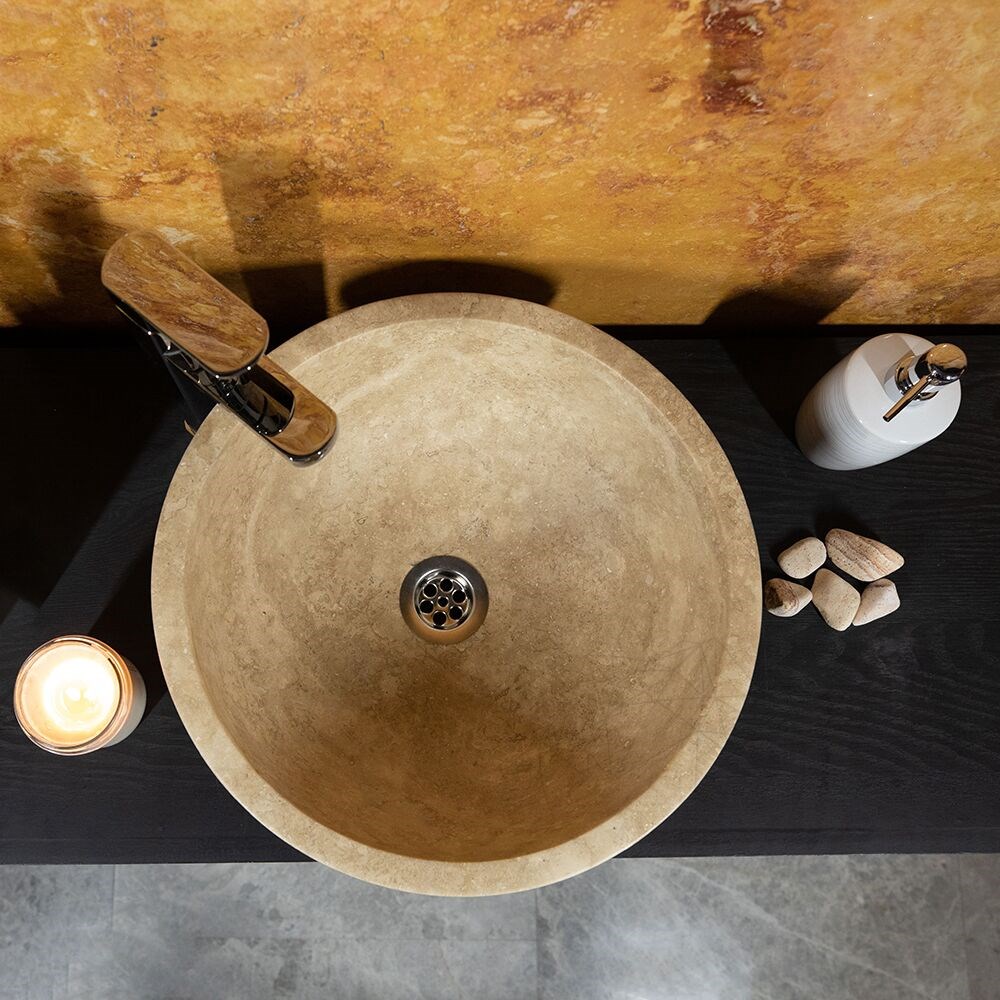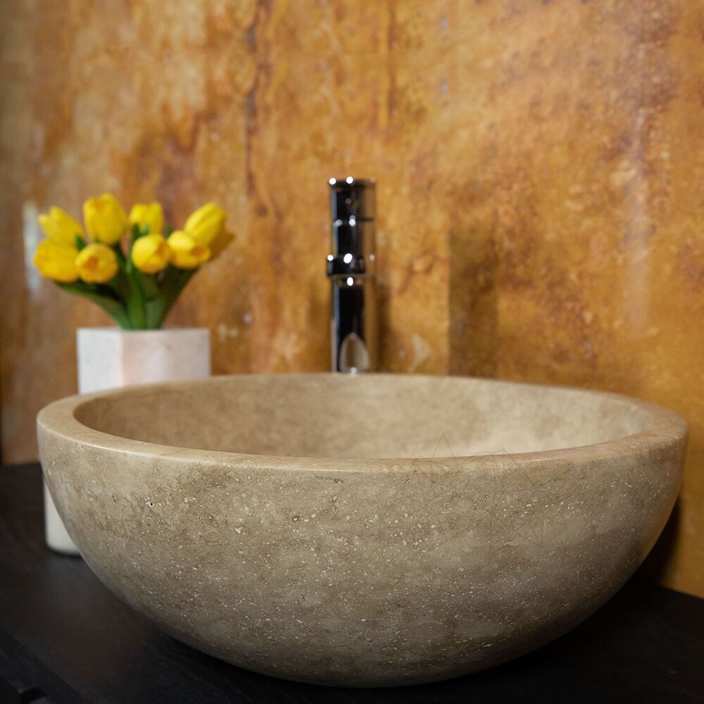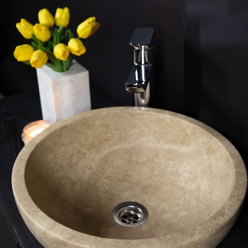 Blatul din Piatra Naturala este cea mai buna alegere pentru suportul Lavoarului din Travertin. Blatul din Piatra Naturala are rezistenta si durabilitate si poate sustine Lavoarul din Travertin pe suprafata sa. Inainte de montaj se caroteaza blatul pentru trecerea sifonului