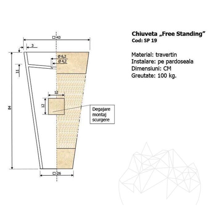 Sunt obiecte care aproape cer singure un loc privilegiat intr-un spatiu, care au nevoie de intreaga atentie. Un asemena obiect este chiuveta de baie din travertin Classic SP-19. Aceasta uimeste prin mixul texturilor sale: delicata in partea de sus si la baza, dar aspra (scapitata) in partea mediana. In acelasi timp, culoarea relaxanta si inaltimea remarcabila sunt alte elemente usor de asociat cu restul decorului. Poate fi utilizata incepand de la o amenajare mediteraneana, pana la rustica, dar si intr-un mediu caracterizat de eleganta si sobrietate clasica. Produsul este disponibil la dimensiuniile: 43 cm, H: 84 cm, ambalat la lada. Pentru un montaj corect, recomandam sa apelezi la serviciile unui specialist