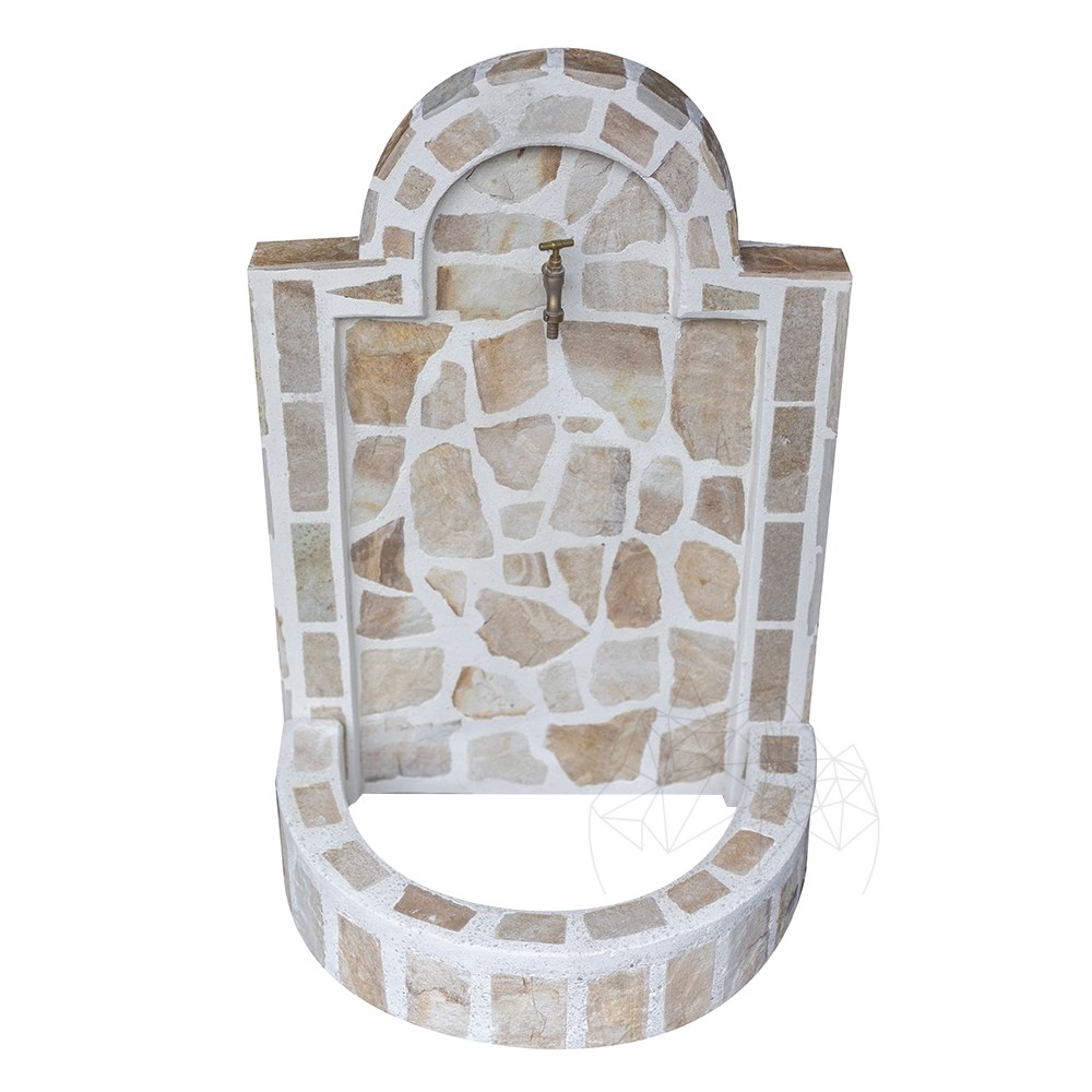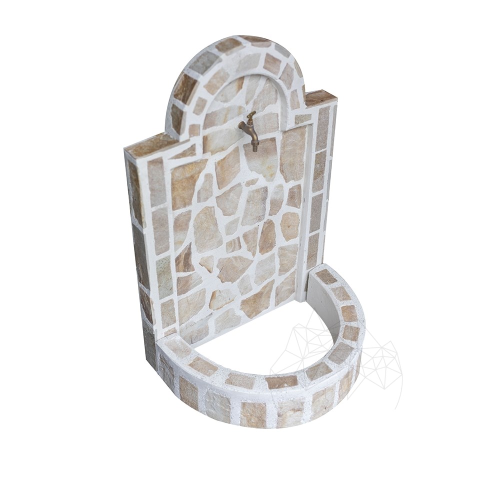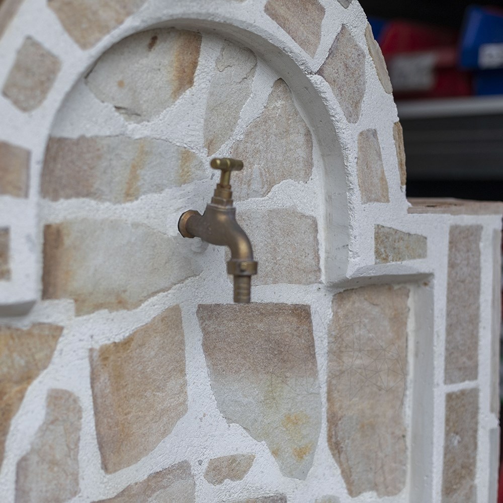 - aspectul cismelei este unul rustic traditional si se datoreaza placarii cu ardezie Rhodos. Placile se aleg cu grosimi cat mai reduse (1-3 cm), pentru corpul cismelei se foloseste piatra poligonala iar pentru cuva si lateralele corpului placi dreptunghiulare. Astfel aspectul general este unul armonios.