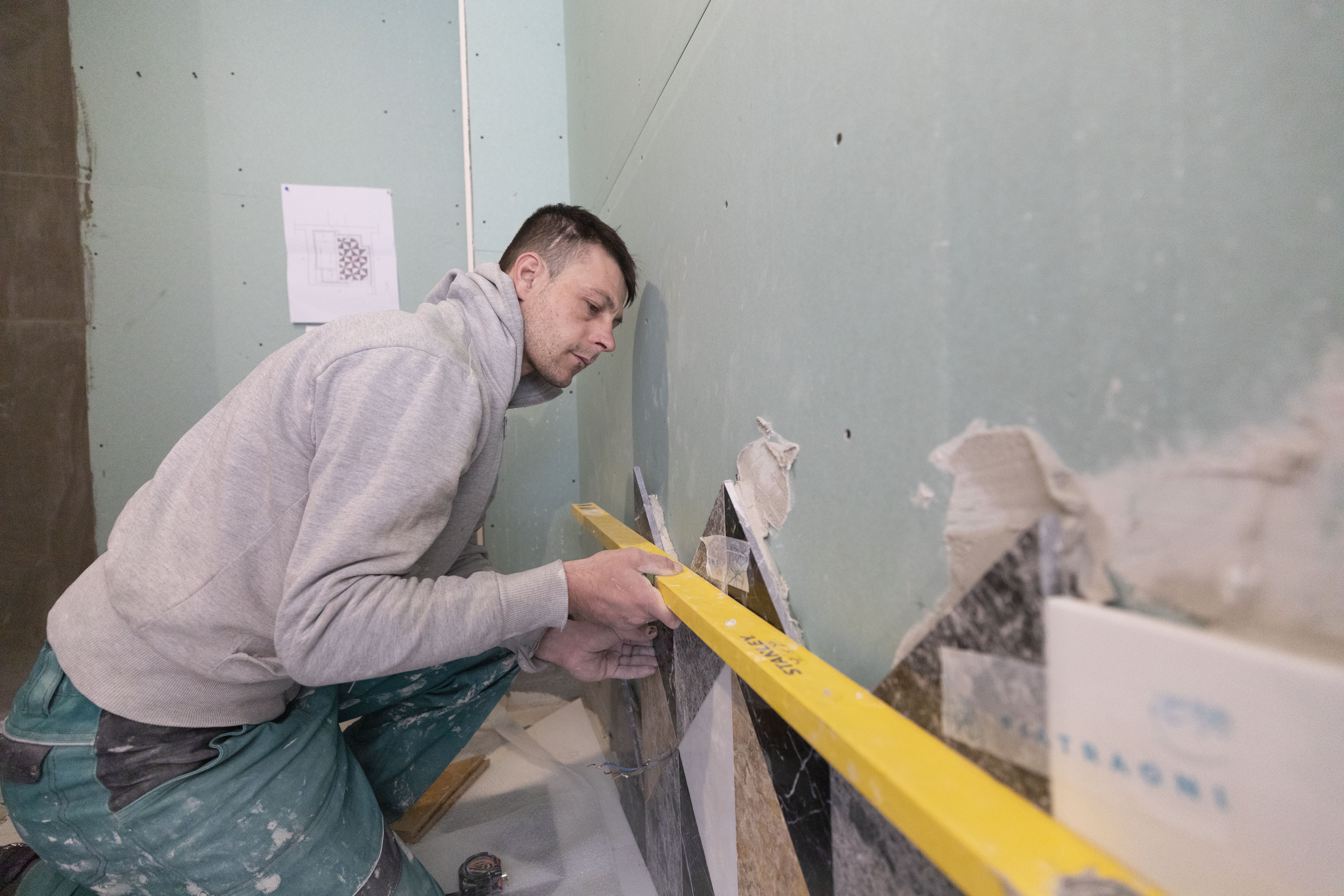 - 4. Montajul plăcilor: Plasează fiecare bucată cu grijă, presând ușor și mișcând-o ușor stânga-dreapta pentru fixare. Verifică constant nivelul și alinierea cu un boloboc. În cazul montajului pe pereți, folosește distanțiere și un profil de sprijin la bază pentru a preveni alunecarea plăcilor până la prinderea adezivului.