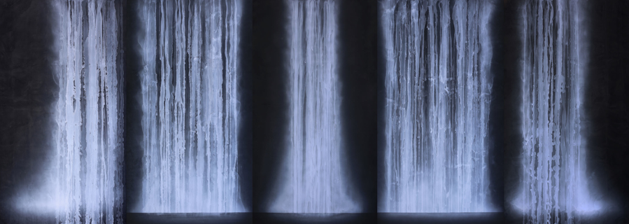 Falling Water, 2020, pigmenti minerali natural si Gofun (alb de perla facut din stridii, scoici) pe hartie japoneza washi, montata pe 5 panouri din lemn interconenctate, sursa foto: Pangrati Design