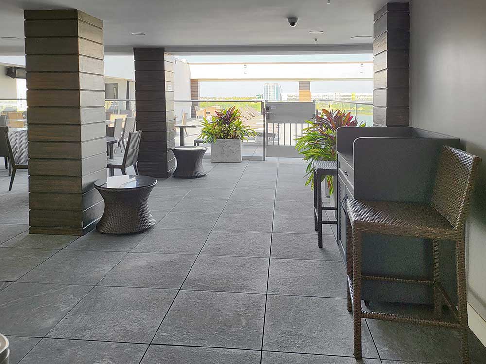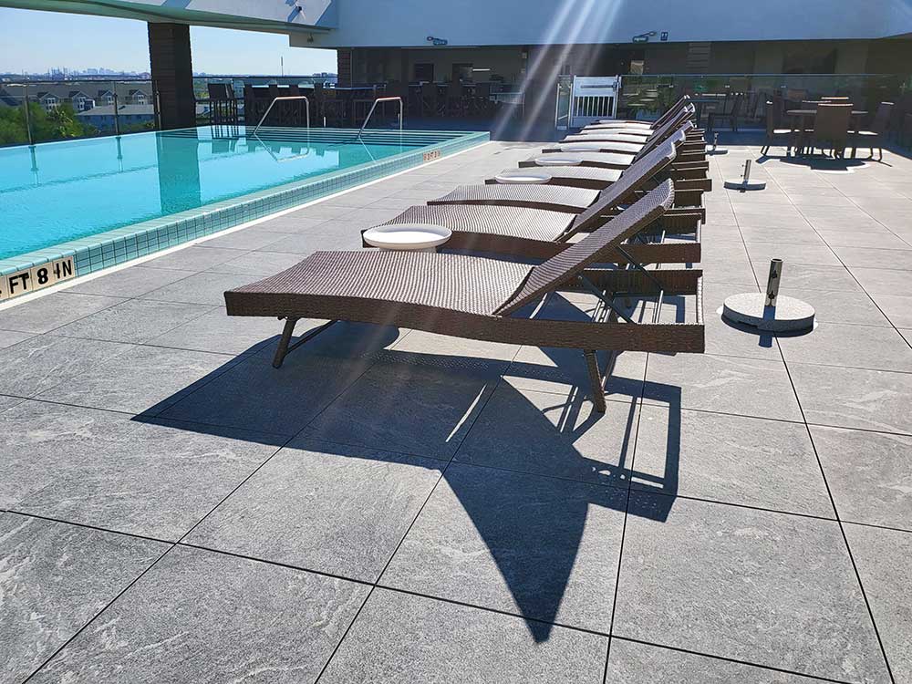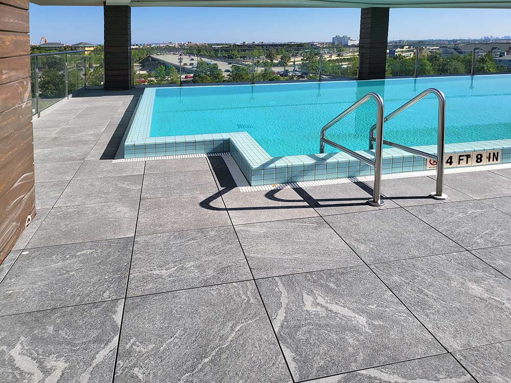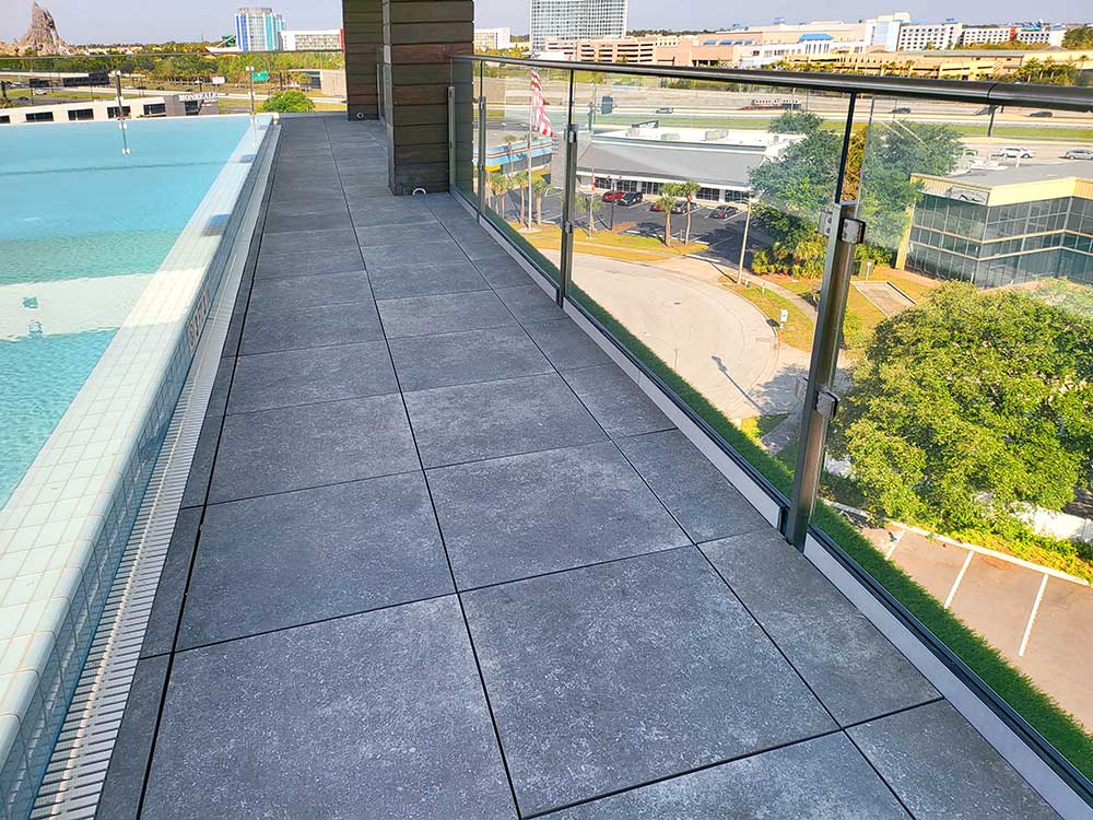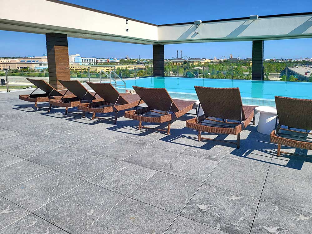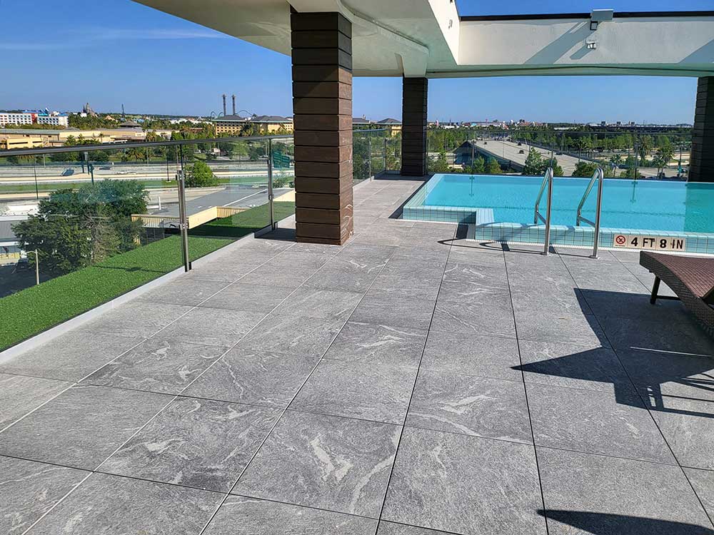 Priveliștea spectaculoasă asupra orașului Orlando transformă terasa hotelului într-un spațiu strategic, unde estetica trebuie să se îmbine armonios cu rezistența tehnică. Într-o zonă predispusă la condiții extreme, inclusiv furtuni tropicale și uragane, alegerea materialului a fost esențială.Plăcile L’Atra Pietra Super Hard Keramik 3 cm au fost selectate pentru acest proiect datorită: