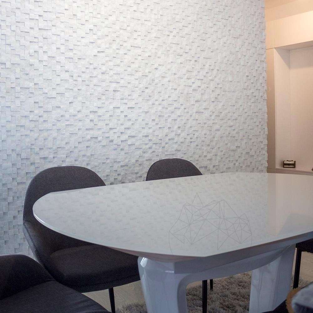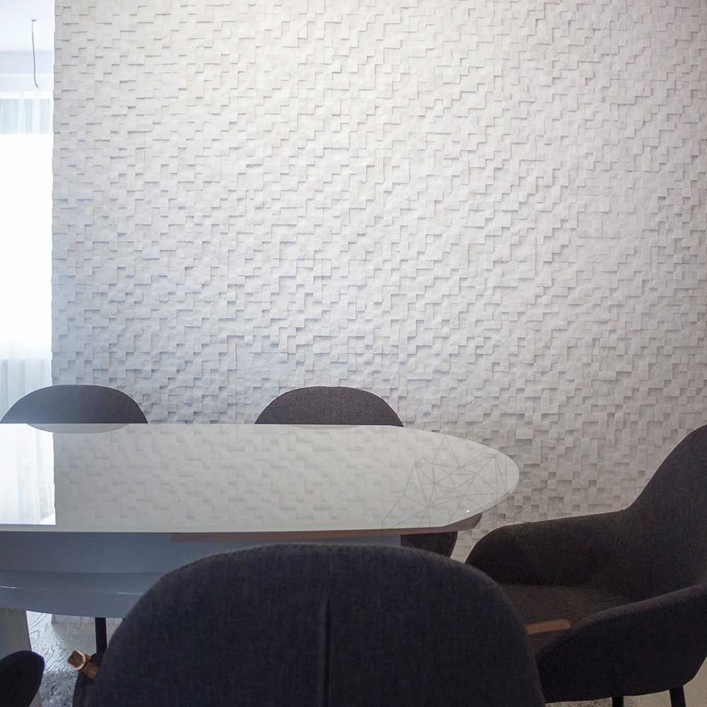 O marca a exclusivitatii, mozaicul din marmura Thassos 3D cu finisaj scapitat 2.8 x 2.8 cm reflecta nu doar calitatile propria, ci intreaga structura arhitecturala a spatiului pe care il ocupa.