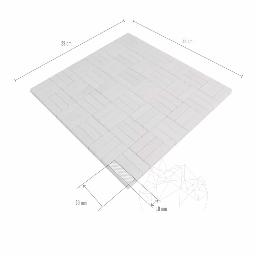 In varianta Tetris aceasta marmura creeaza un efect multi-dimensional usor de retinut si apreciat cu siguranta. Dimensiune plasa 30.5 x 30.5 cm / 1 cm grosime. In varianta tetris aceasta marmura creeaza un efect multi-dimensional usor de retinut si apreciat cu siguranta. Este o marmura luminoasa si puternica avand la baza o compozitie accentuata de cristale. Nu prezinta venatura si nu este caracterizata prin nuante de culoare ci o culoare alba constanta. Montajul se realizeaza rapid si usor si se recomanda tratamente de impermeabilizare pentru ca aceste pietre sa-si pastreza valoarea estetica si proprietatile fizice timp indelungat. Cu acest mozaic din marmura Thassos se pot executa proiecte verticale sau orizontale, incaperea capatand un aspect mult mai larg si luminos. Se poate monta mai ales in bai unde lumina patrunde mai greu. In bucatarie ajuta la decorarea eleganta a spatiului.