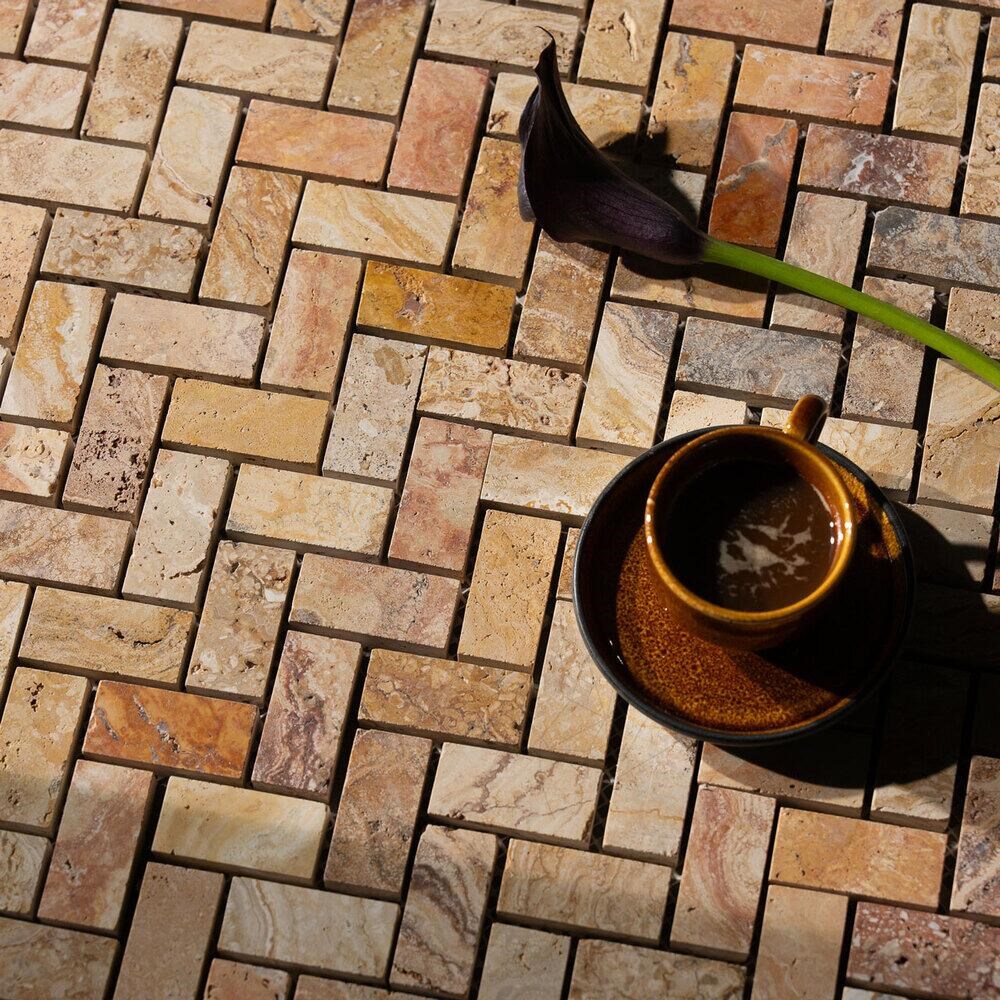 Mozaicul Peach Chevron din travertin polisat aduce un accent distinct in orice proiect de amenajare interioara sau exterioara. Acest tip de piatra naturala este recunoscut pentru textura sa unica si nuanta calda de portocaliu, ce confera spatiilor un aer sofisticat si modern. Mozaicul este montat pe plasa, ceea ce permite aplicarea facila chiar si pe suprafete curbe sau pereti cu forme atipice.