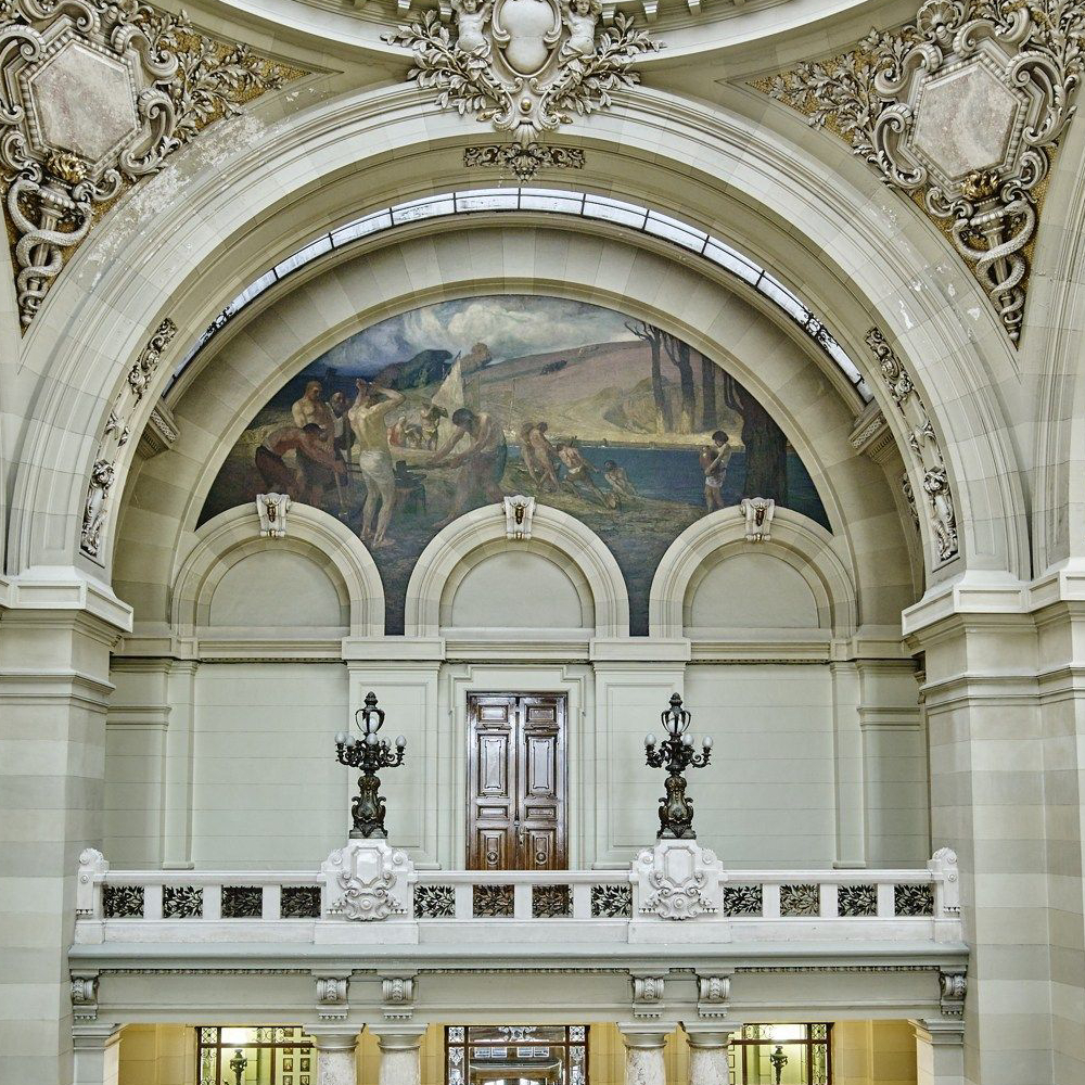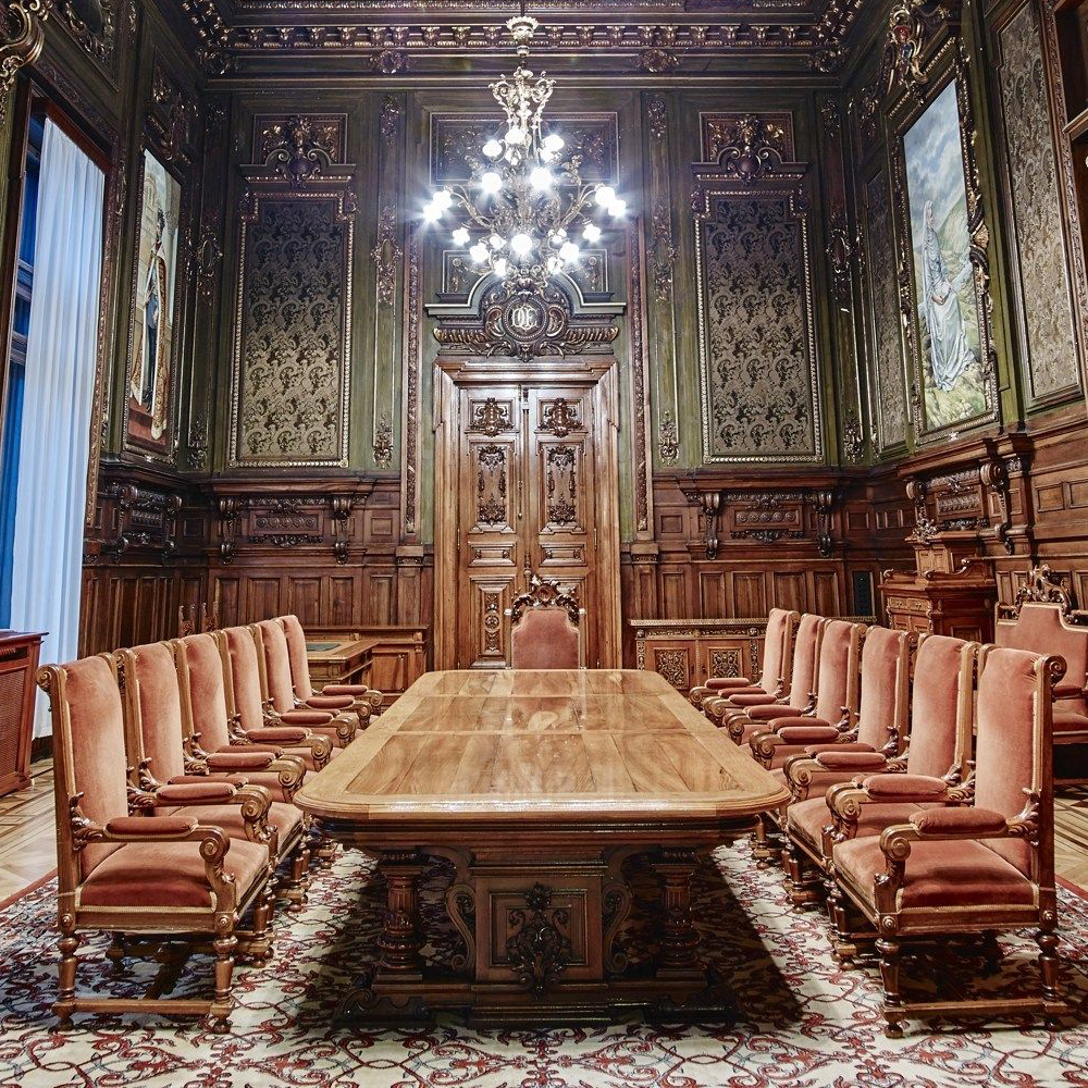 A fost gandita tot de arhitectul Paul Gottereau - holul mare a fost decorat cu o pictura murala reprezentand Zeita Fortuna distribuind bunuri dupa Independenta, opera a lui Mihail Simonidi. Acesta a realizat si pictura plafonului salii festive de la etaj. Pe peretii laterali au existat, pana in anul 1948, portretele Regelui Carol I, al Reginei Elisabeta – pictate tot de Mihail Simonidi, precum si portretele Regelui Ferdinand I si a Reginei Maria – pictate de Costin Petrescu. Odata cu venirea comunistilor la putere, portretele au fost acoperite cu vopsea, insa au fost recreate ulterior printr-o munca minutioasa de documentare si cercetare, de catre artistul plastic contemporan Valentin Tanase. Probabil cea mai impresionanta incapere a palatului este „Sala de consiliu”, care si-a pastrat si astazi destinatia.