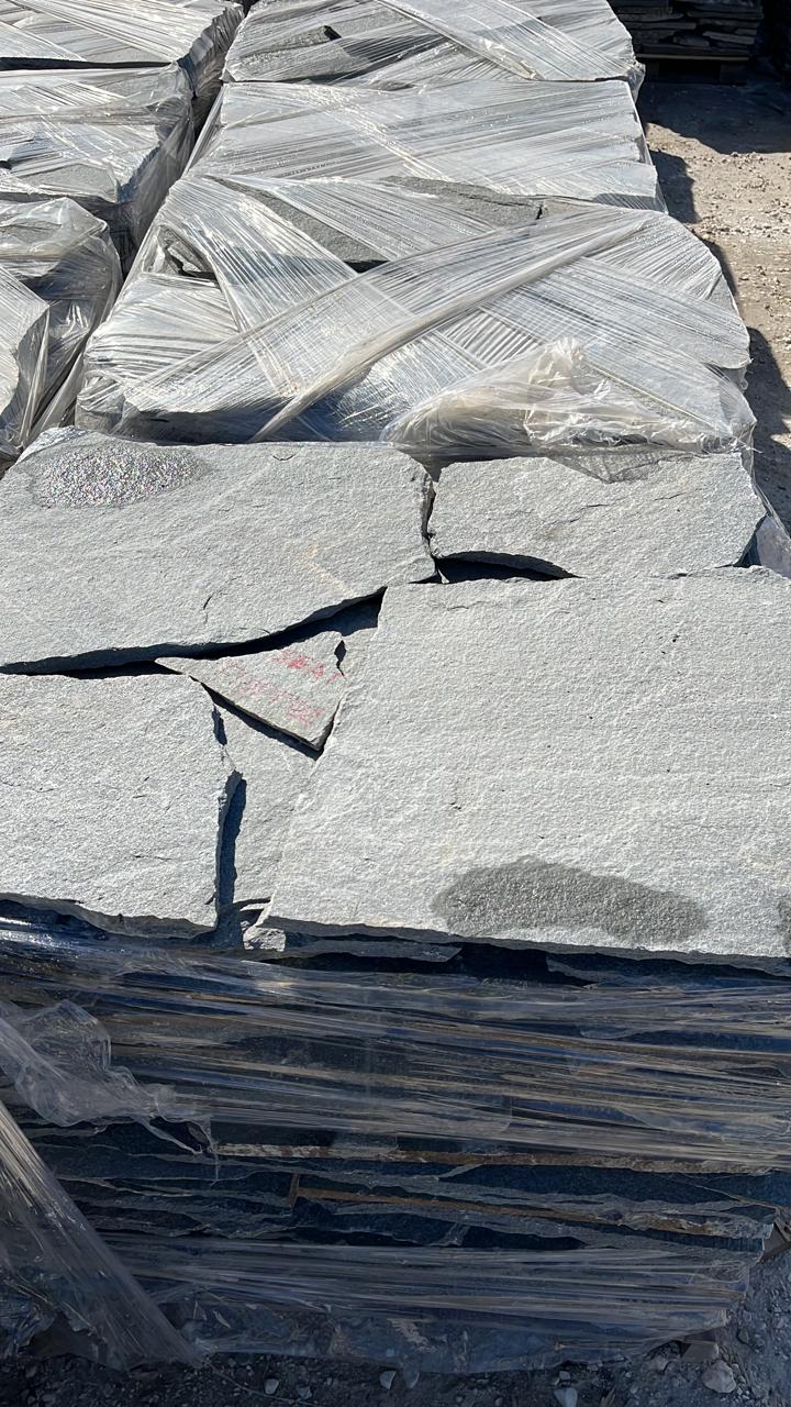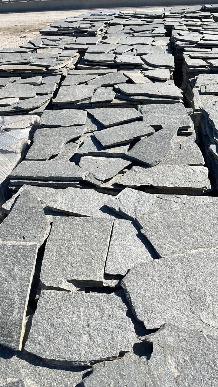 Kavala nu este „o singură piatră". Există o gamă largă de formate: dale tăiate (sawn-cut) subțiri — pentru placări interioare sau fațade; dale și plăci pentru exterior, de grosime medie de 2–3 cm sau mai mult, pentru pavaje, alei și terase; formate poligonale sau neregulate (polygonal slate / crazy paving) — ideale pentru curți, grădini și terase cu personalitate. Suprafața naturală, textura variabilă și gama cromatică gri–antracit permit utilizări multiple — de la proiecte rustice la minimalism urban, de la exterior la interior.