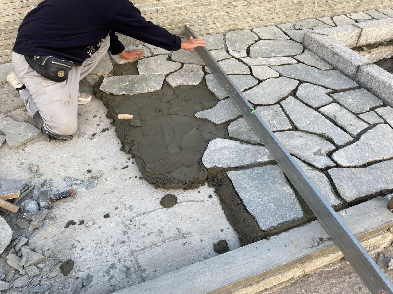 Nu orice piatră naturală devine elegantă și durabilă dacă nu este montată corect — de aici diferența dintre un pavaj banal și o amenajare de top. Pentru dale și formate poligonale de 2–4 cm grosime, se recomandă pat de mortar sau șapă stabilă, pentru o bază uniformă și drenaj corect. Pentru placări interioare sau fațade se folosește adeziv flexibil compatibil cu ardezia. Rosturile se adaptează în funcție de aplicație — mai late și cu mortar de bună aderență pentru exterior, mai înguste și cu chituire discretă pentru interior. La exterior, un tratament de impermeabilizare protejează piatra pe termen lung fără a altera textura naturală. Verificarea planimetriei, pantei și drenajului este vitală pentru orice pavaj exterior — piatra rezistă, dar montajul incorect poate genera fisuri, alunecări sau stagnări de apă. La PIATRAONLINE, oferim consultanță și montaj autorizat — ne asumăm responsabilitatea ca materialul să fie pus corect și să dureze decenii.