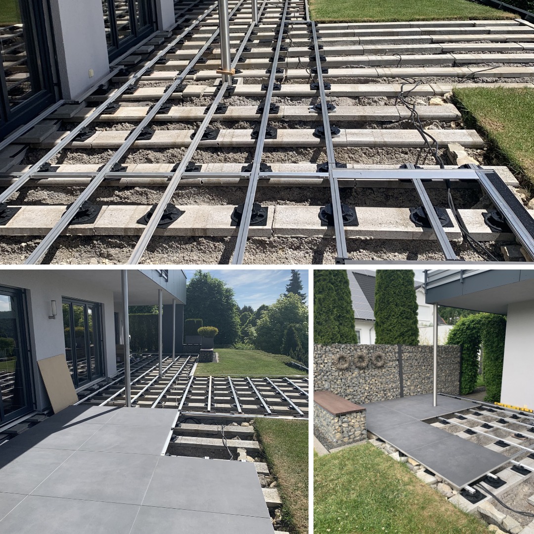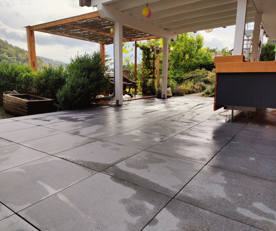 Pentru arhitect, avantajul concret este dublu: elimină necesitatea pantelor pronunțate de scurgere — care complică detaliile de racordare la trotuar, la perete sau la mobilierul de terasă — și reduce sau chiar elimină rigolele vizibile, care fragmentează compoziția vizuală a unui spațiu exterior altfel coerent. Suprafața rămâne plană, curată, cu un limbaj formal omogen, indiferent de volumul de precipitații.