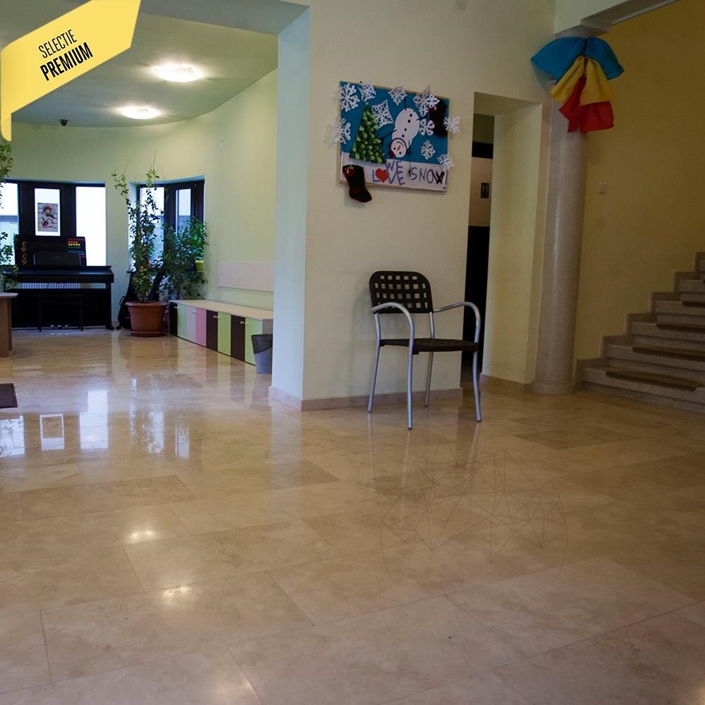 O dimensiune de placa mare, care pune in valoare spatiul. Travertinul Classic PREMIUM aduce proiectului unde este folosit nuante frumoase datorita calitatii sale superioare, va adauga oricarui concept de amenajare o amprenta fina, eleganta si calda. Pentru a pastra aspectul intact, este recomandata impermeabilizarea placilor si apoi va rocomandam intretinerea cu detergenti speciali (ex: LTP Waxwash). O placa de travertin taiata la dimensiuni mai mari, de 40,6 x 61 cm, adauga spatiului o nota de eleganta, si creeaza perceptia de spatiu aerisit, marit. Aspectul dat de polisare (finisajul placii) este stralucitor, procesul fiind unul abraziv, care netezeste suprafata pietrei si ajuta la inchiderea porilor. Travertinul Classic PREMIUM este un material extrem de popular in randurile celor care aleg piatra naturala pentru amenajari, datorita nuantelor sale curate, deschise, luminoase, de o eleganta subtila.