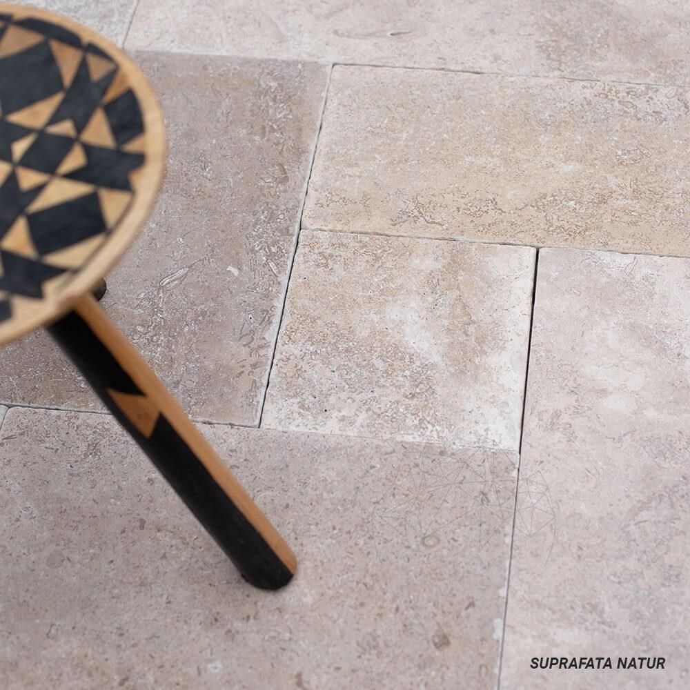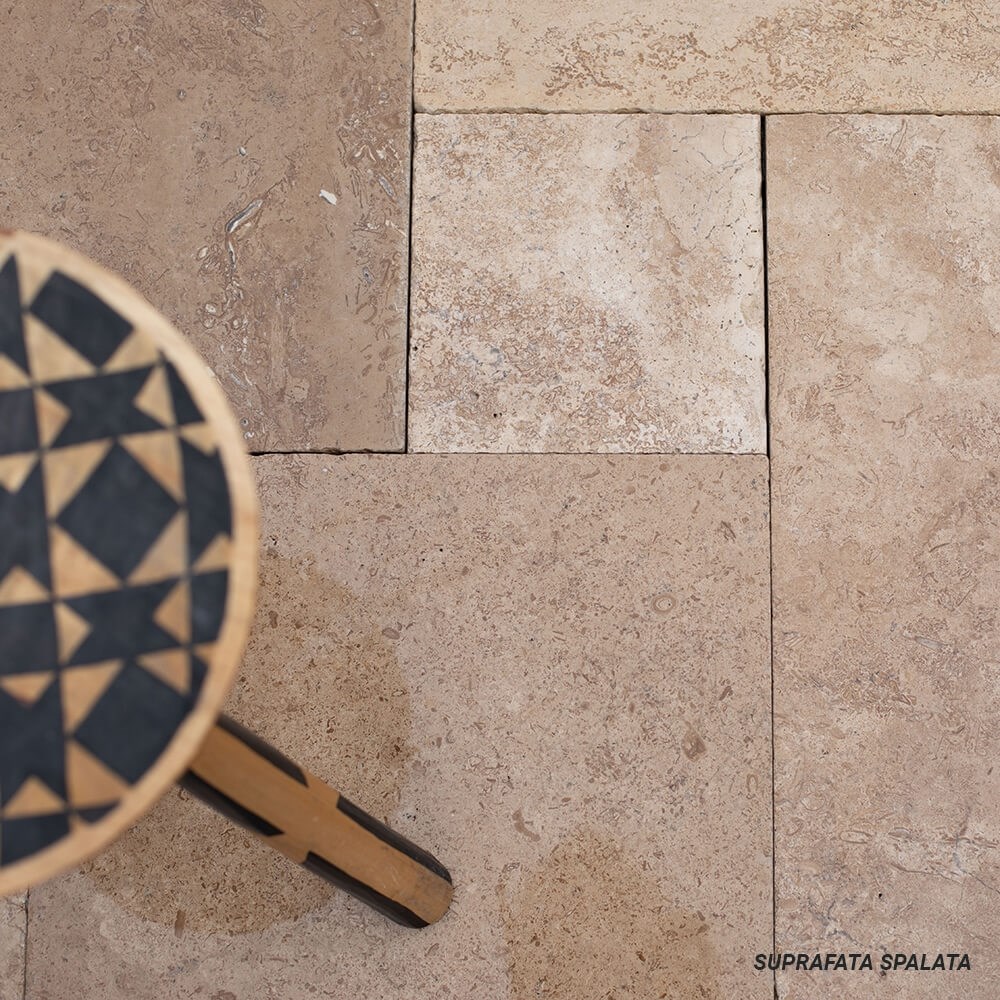 Placile travertin Latte model French Pattern sunt folosite ca material de constructie pentru placari orizontale de interior si la exterior pe holuri, living, terase, podeste, intrari, parcuri si gradini. Finisajul antichizat este antislip.